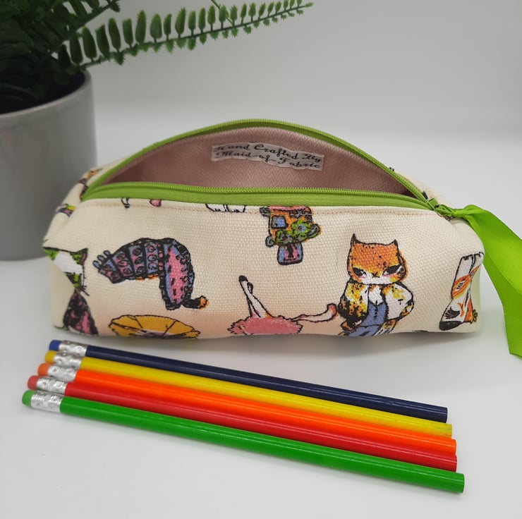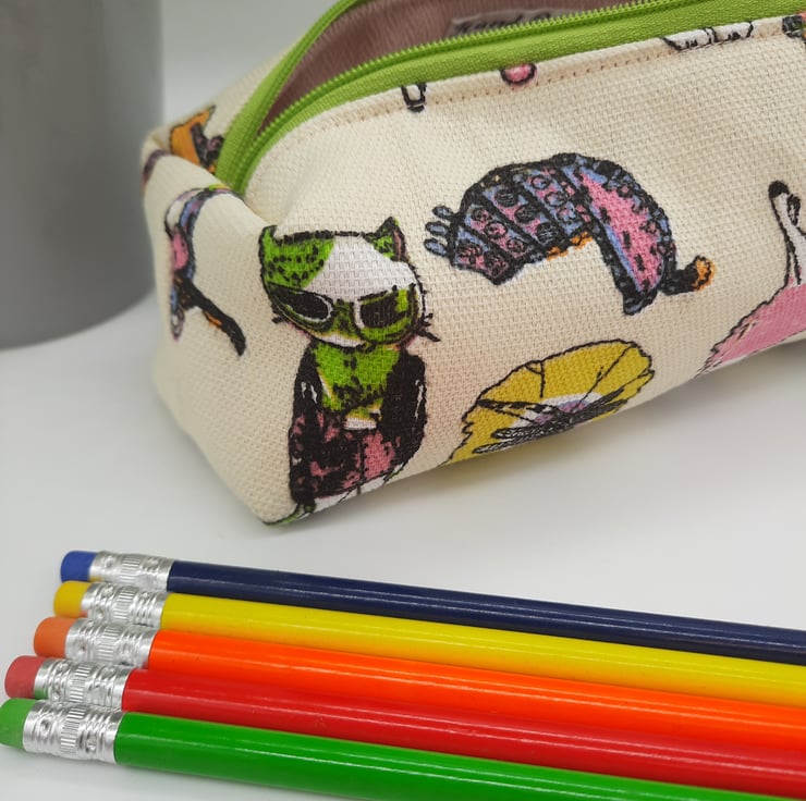 This one is made from a crazy cats fabric. The cats clothed in bright colours. Fully lined with a pink chevron weaved cotton plus it has a interliner to give it structure.