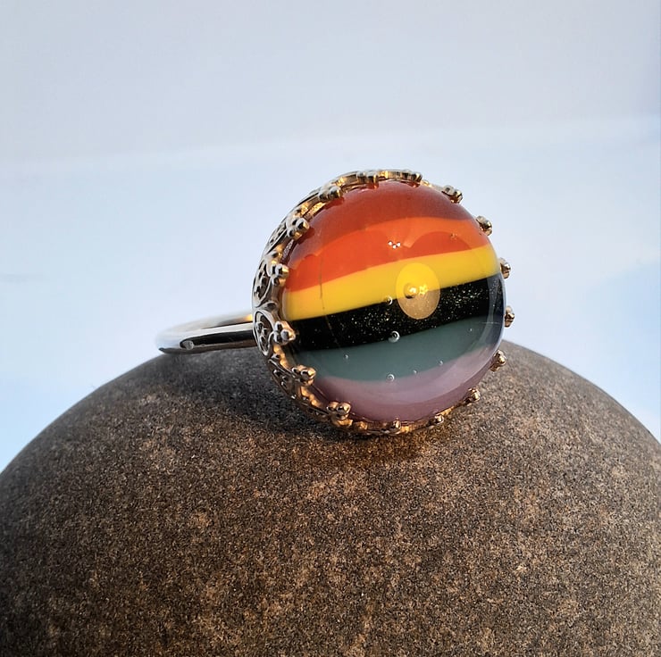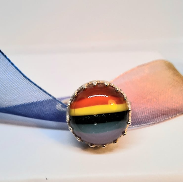 This lovely piece of rainbow coloured glass sits in a fancy silver setting on a silver wire band. It's a lovely one-off to celebrate all things rainbow!