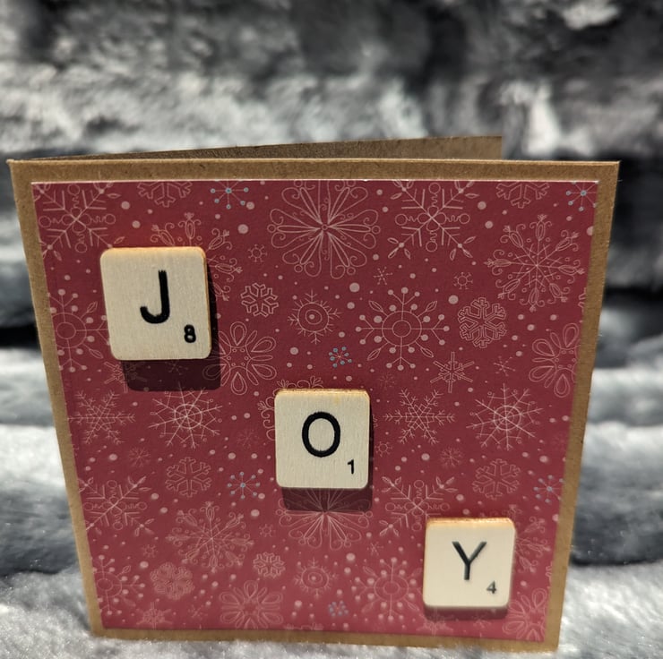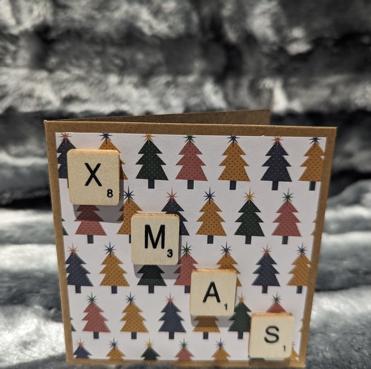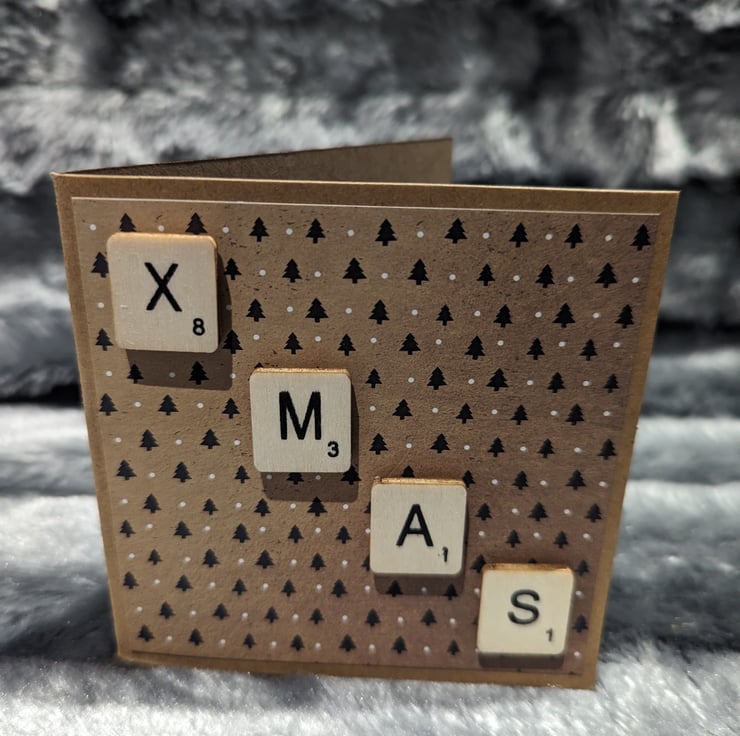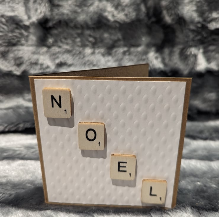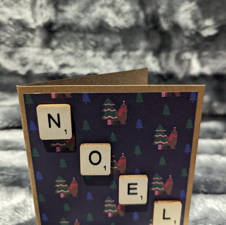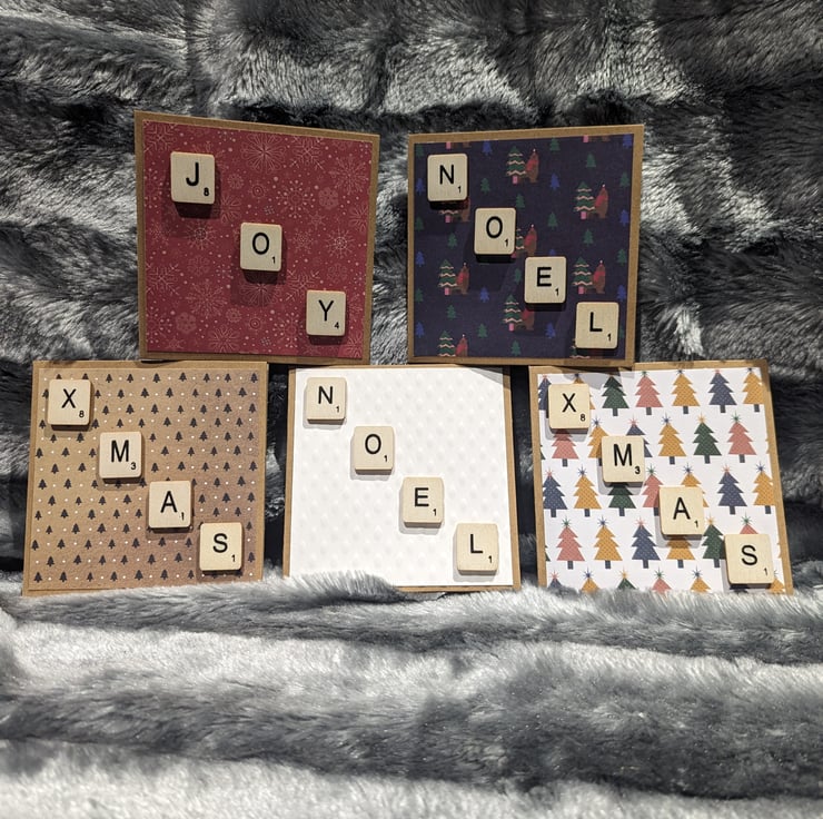 4x4 inch Christmas cards in craft stock, overlaid with Christmas patterned paper and scrabble letters strewn diagonally across to spell a Christmas tiding.