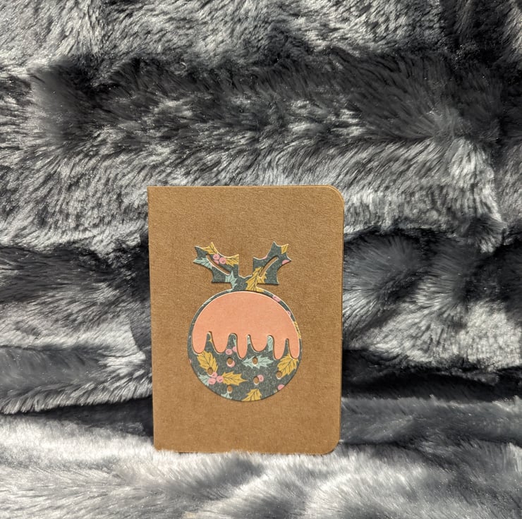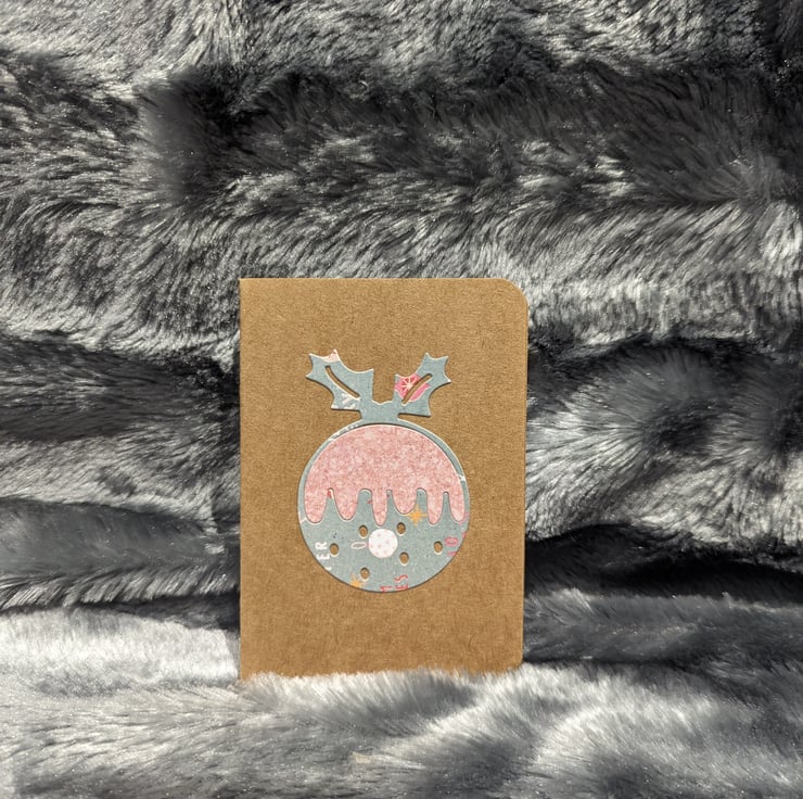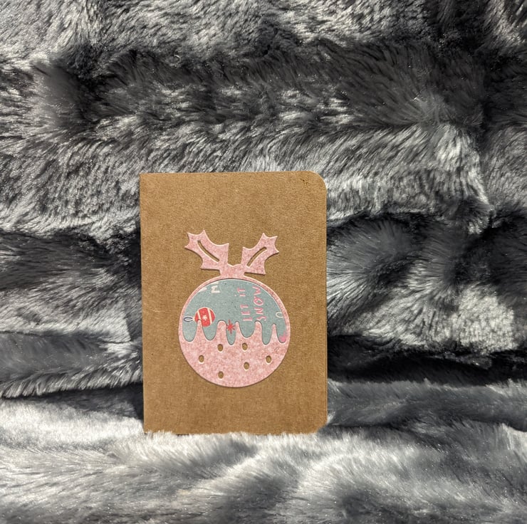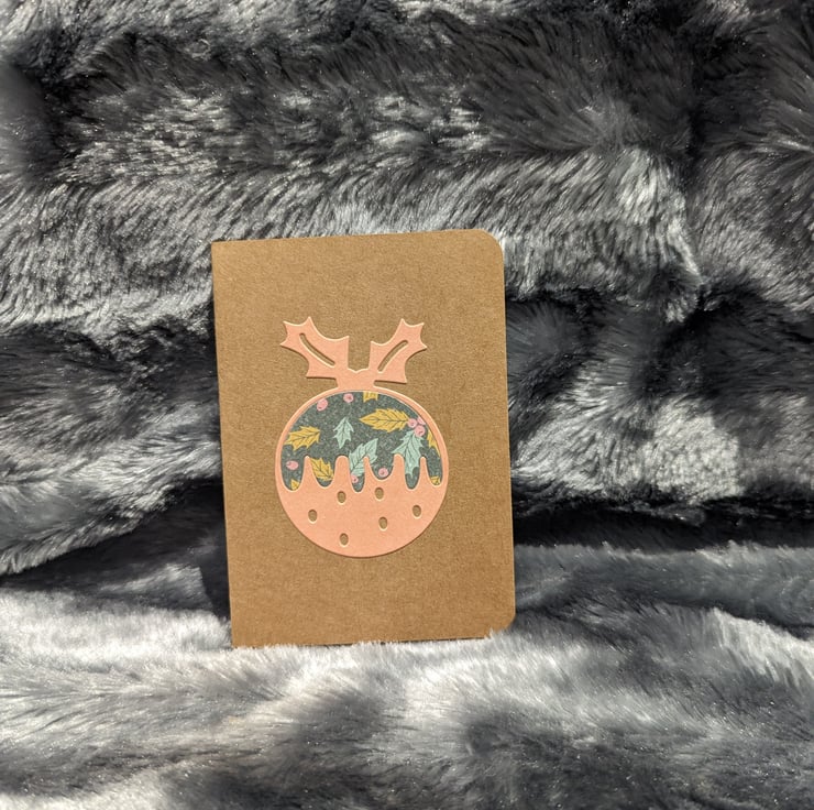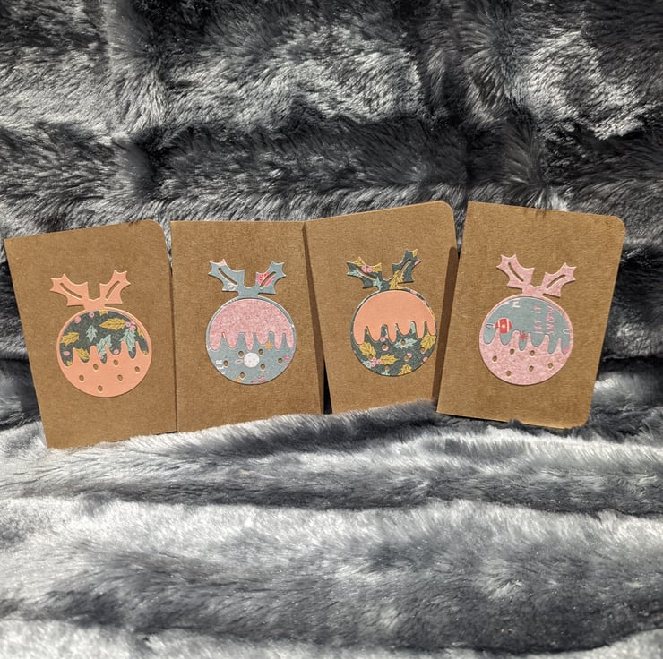 Small but perfectly formed 4x3 inch Christmas cards in craft stock, overlaid with Christmas puds in variations of green and peach