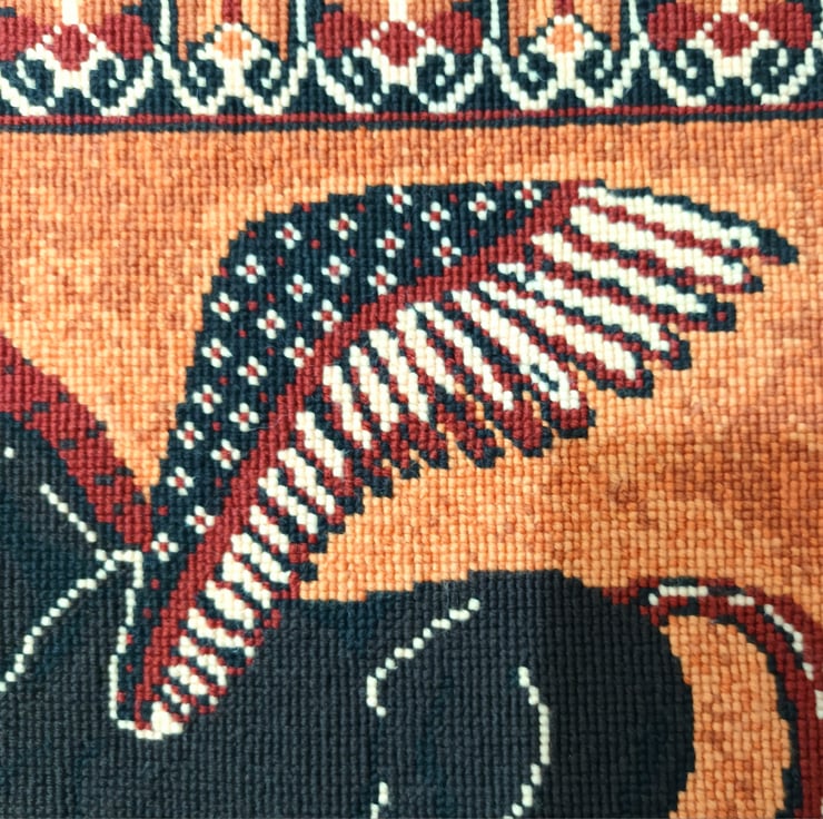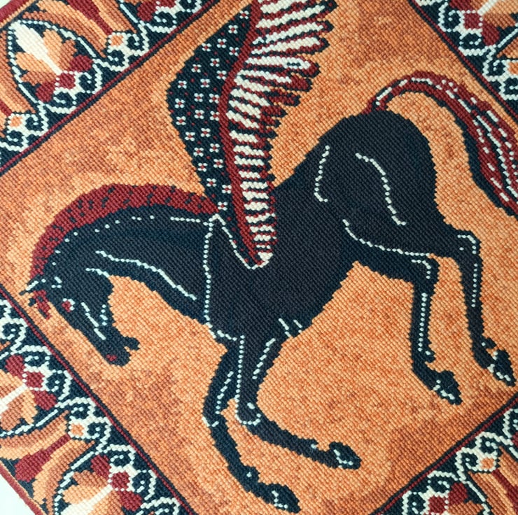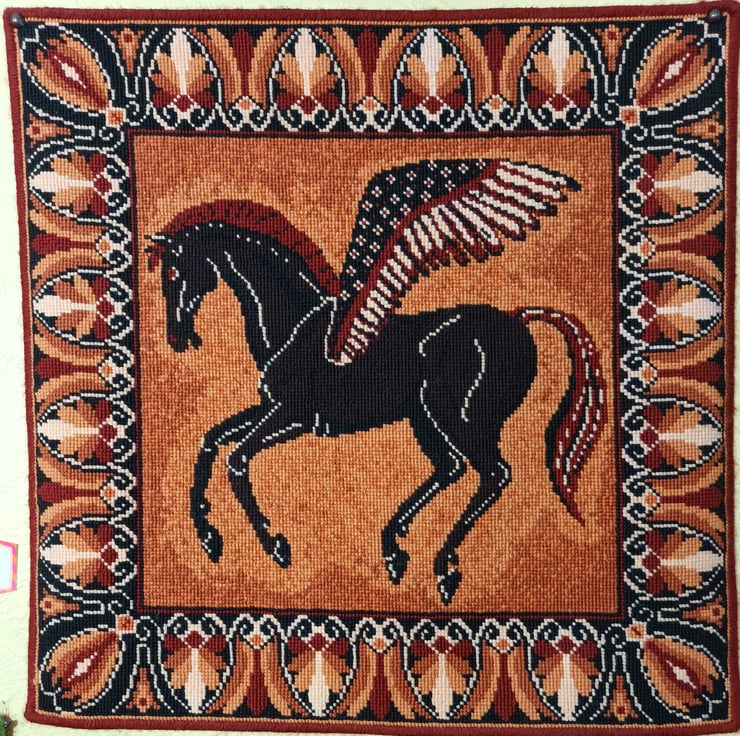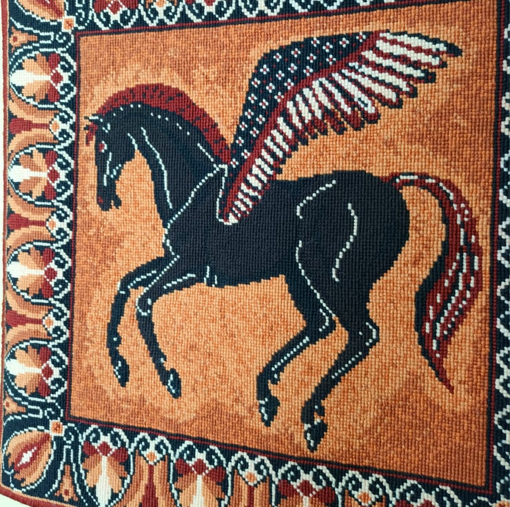 The subtleness of the warm terracotta shades gives the design an extra depth. The variegated stitches in the background highlight Pegasus in the centre with paler shades.