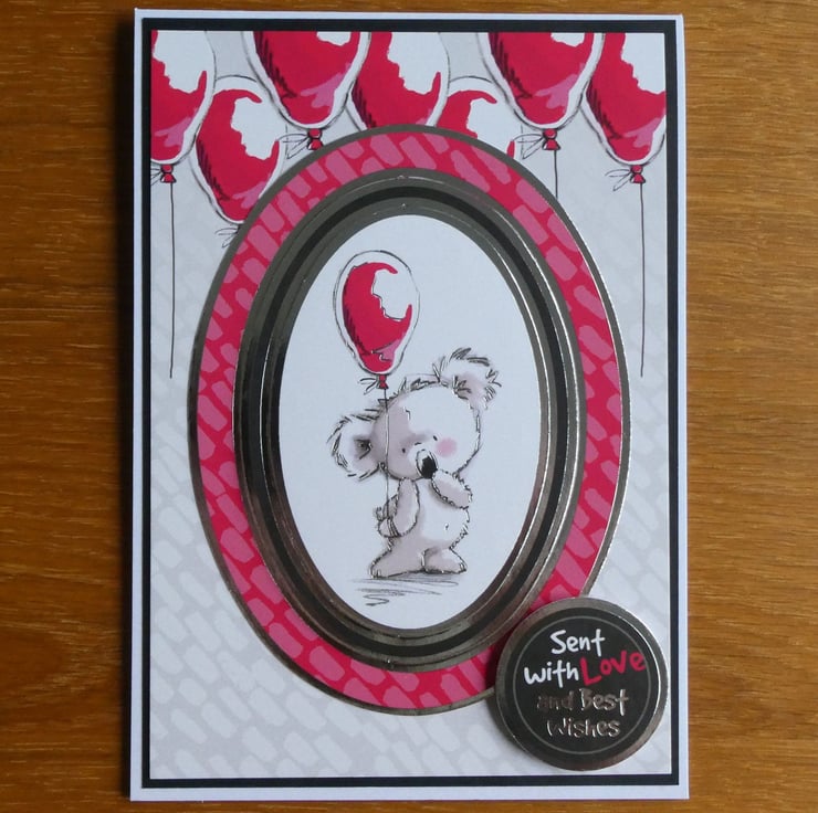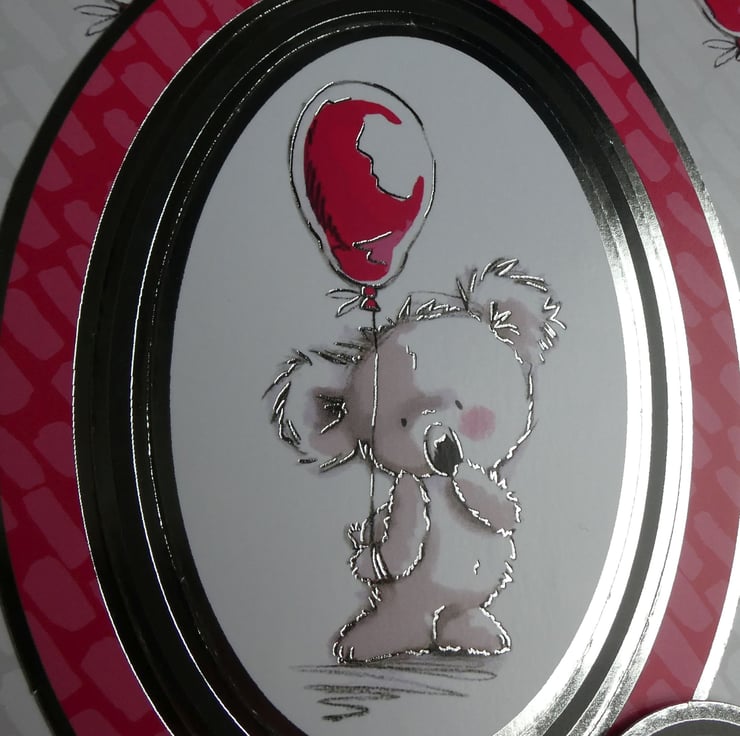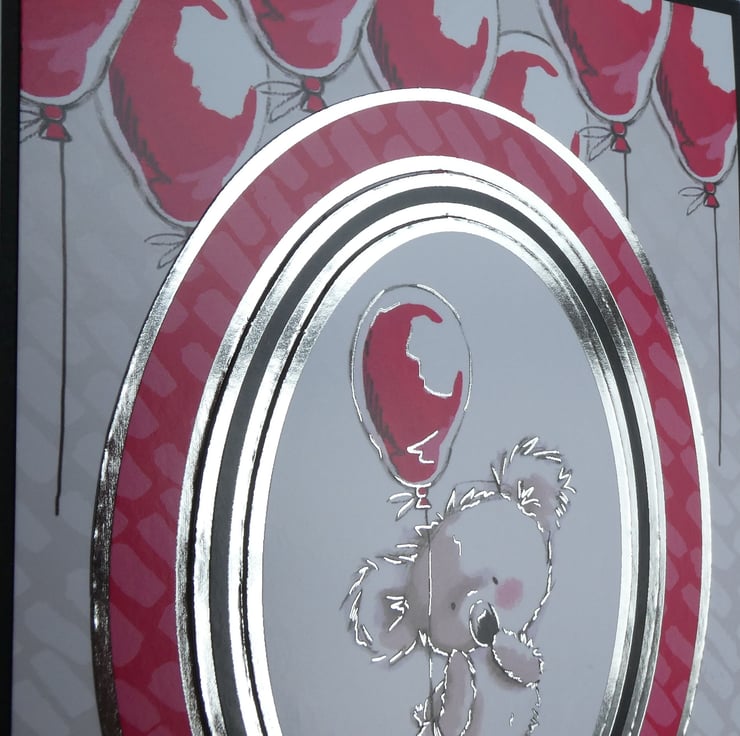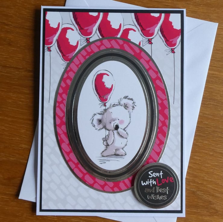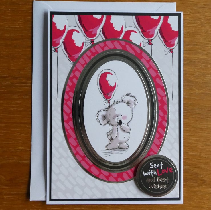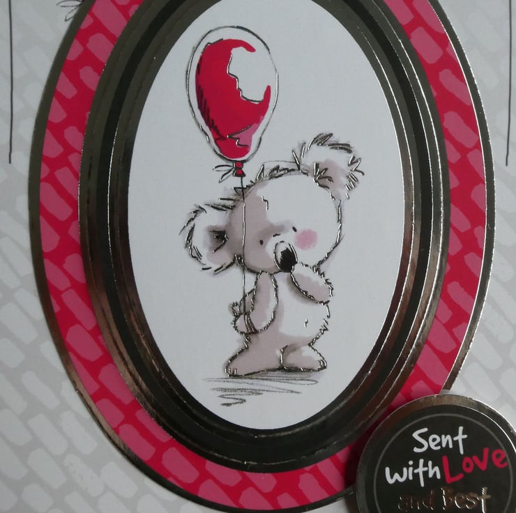 Printed on quality gloss card in shades of pink, red, grey and black with silver foiled details the central oval image shows a cute koala blushing and holding a red balloon. The image is framed with a silver foiled edge and raised on foam pads from the background card which has a design of floating red balloons across the top.