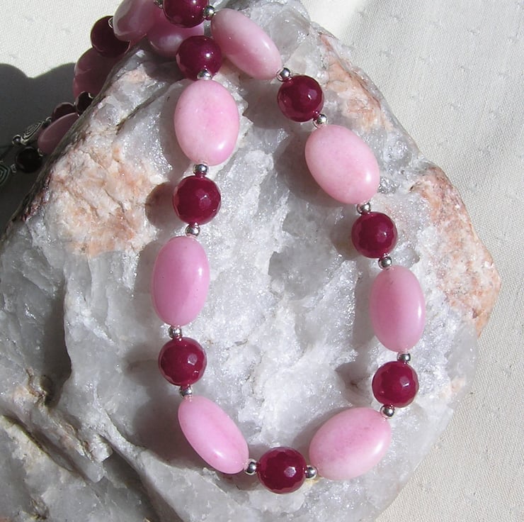 This Stunning Necklace is made from Toffee Pink Rose Quartz Puffy Oval Beads separated by Natural Pink Ruby faceted round beads - a Beautiful warming combination that will look stunning either worn casually or with something more Elegant for a Special Evening out