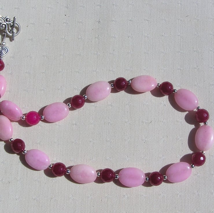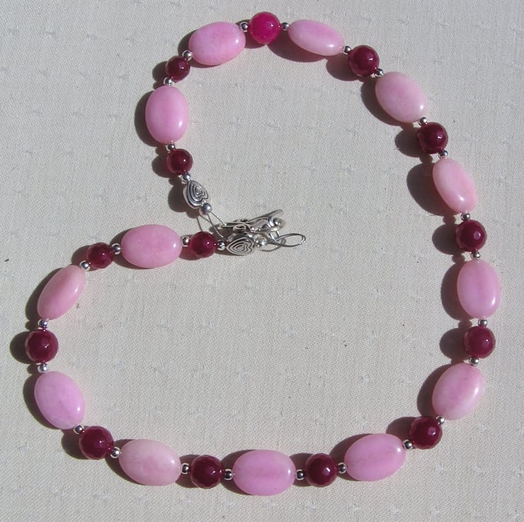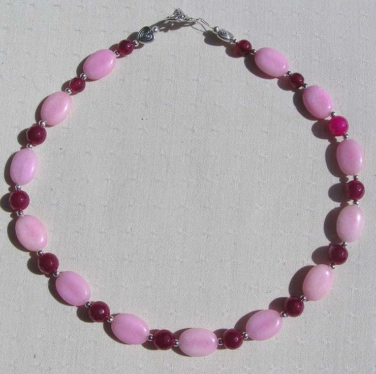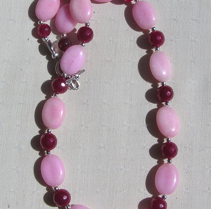 This Stunning Necklace is made from Toffee Pink Rose Quartz Puffy Oval Beads separated by Natural Pink Ruby faceted round beads - a Beautiful warming combination that will look stunning either worn casually or with something more Elegant for a Special Evening out