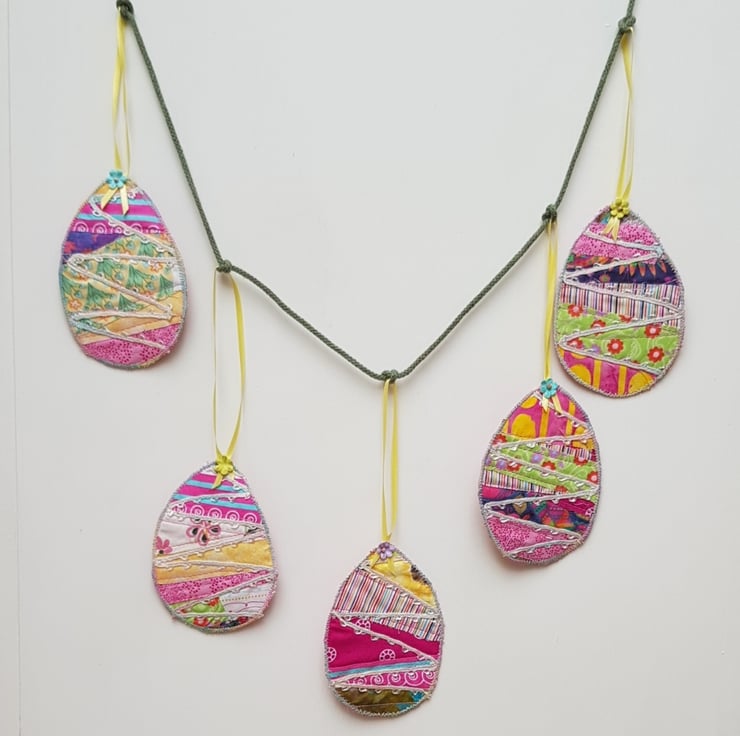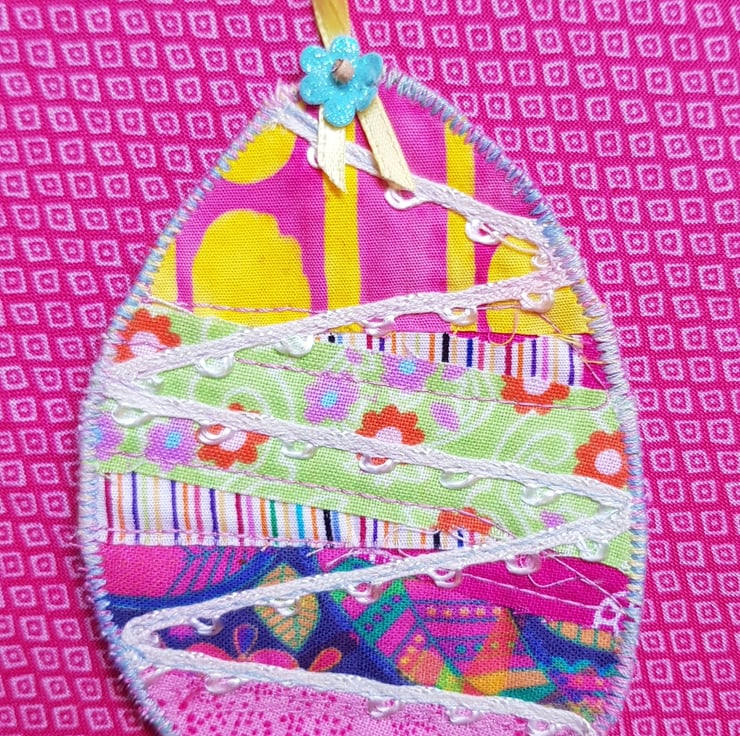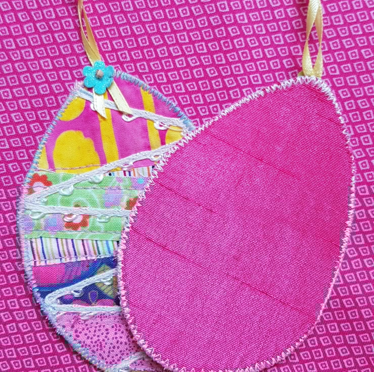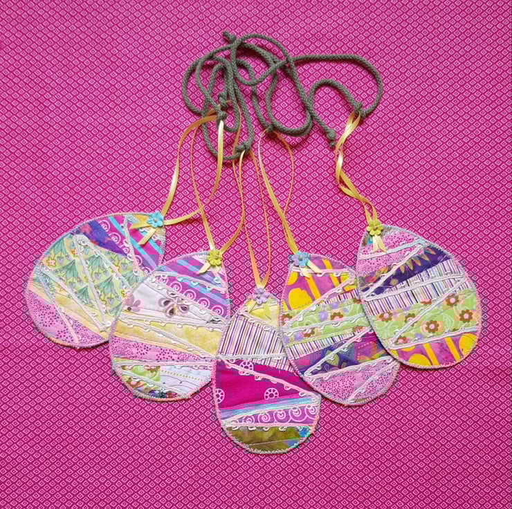 To create this Easter garland I have used small pieces of fabric , stitched these onto calico, decorated each with some machine stitching and ribbon, and backed each one in a bright pink shiny fabric.