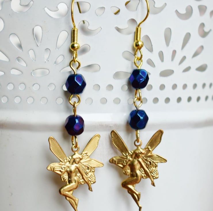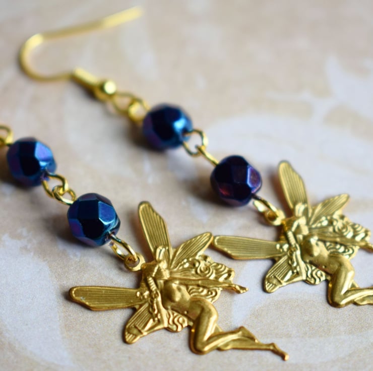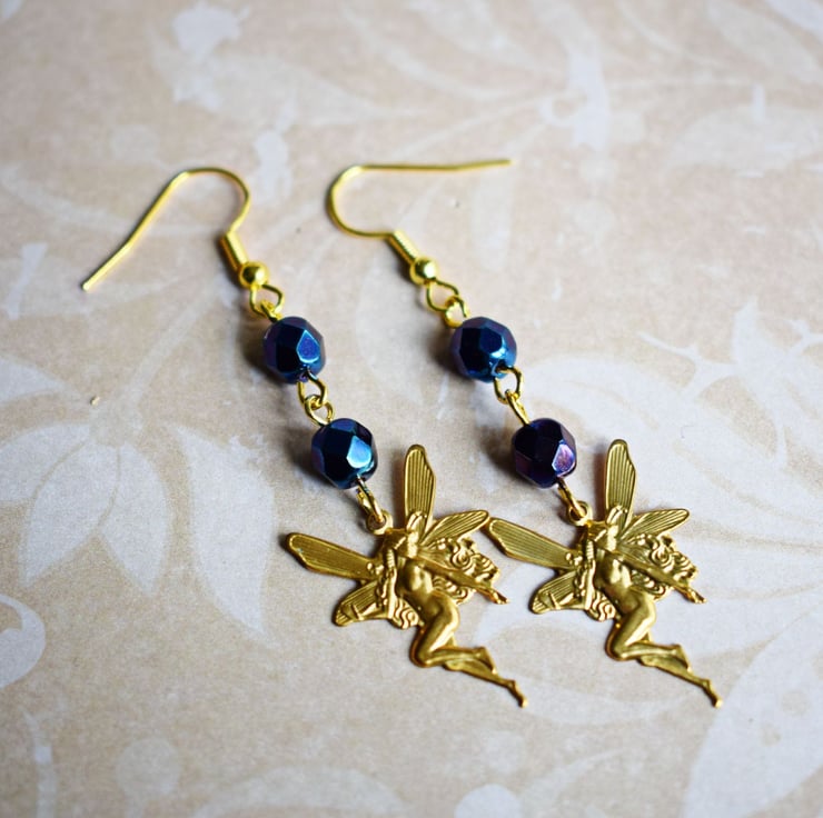 The fairies are brass and are a lovely warm golden colour. They hang below facted jet blue iris Czech glass beads that have an almost oilslick shimmer and catch the light beautifully. The earwires are goldplated and they hang approx 6cm in total or around 2.5 inches.