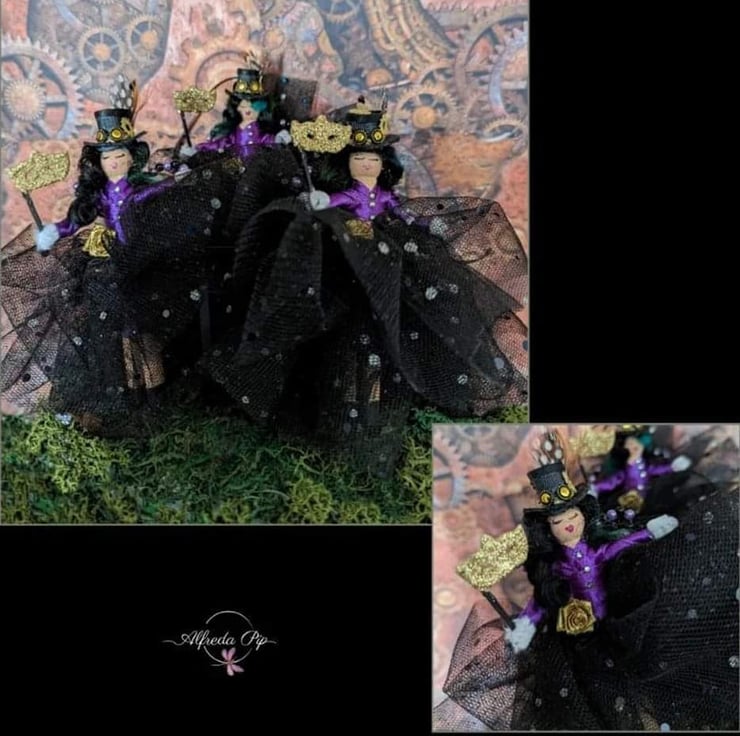 These sweet Nostalgic Fairy dolls bodice are made from dark purple ribbon and skirts from black tulle with a touch of silver sparkle. Each of these Fairys hats and masquerade masks have also been handmade and they all have pearl wings of purple and black.