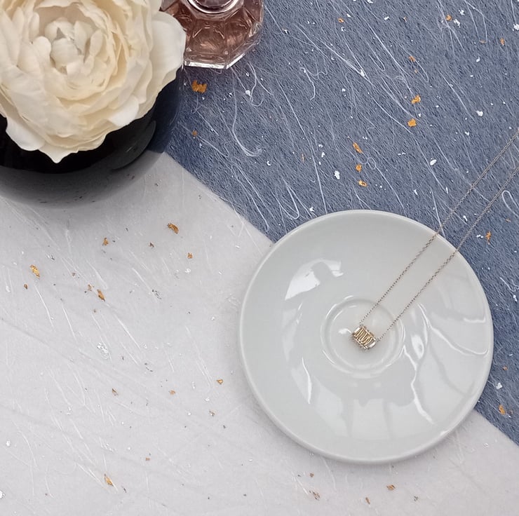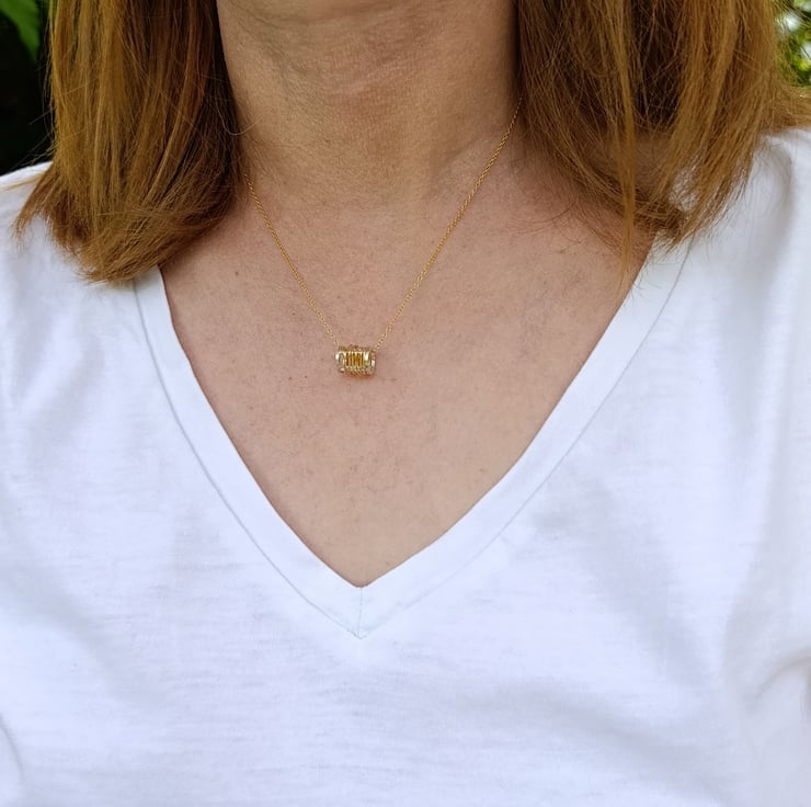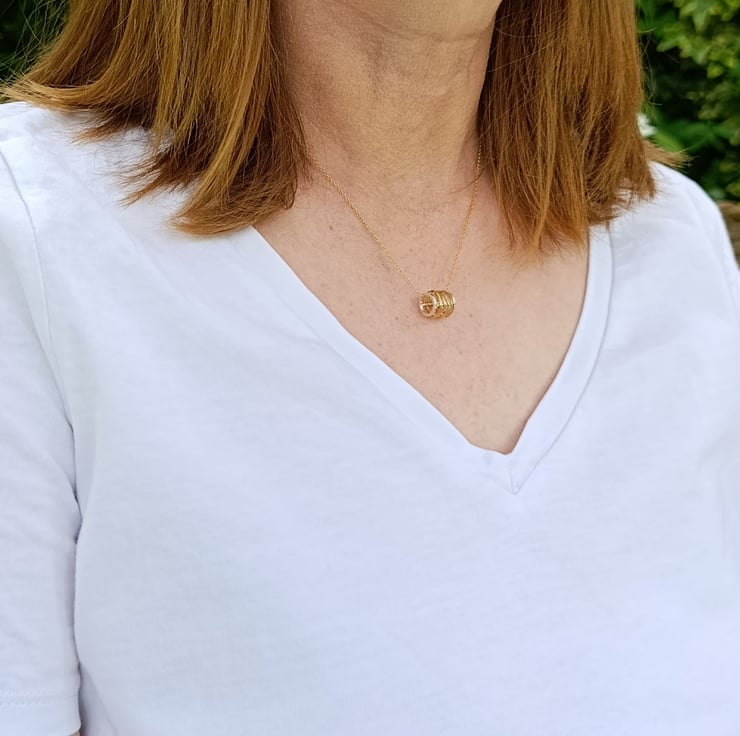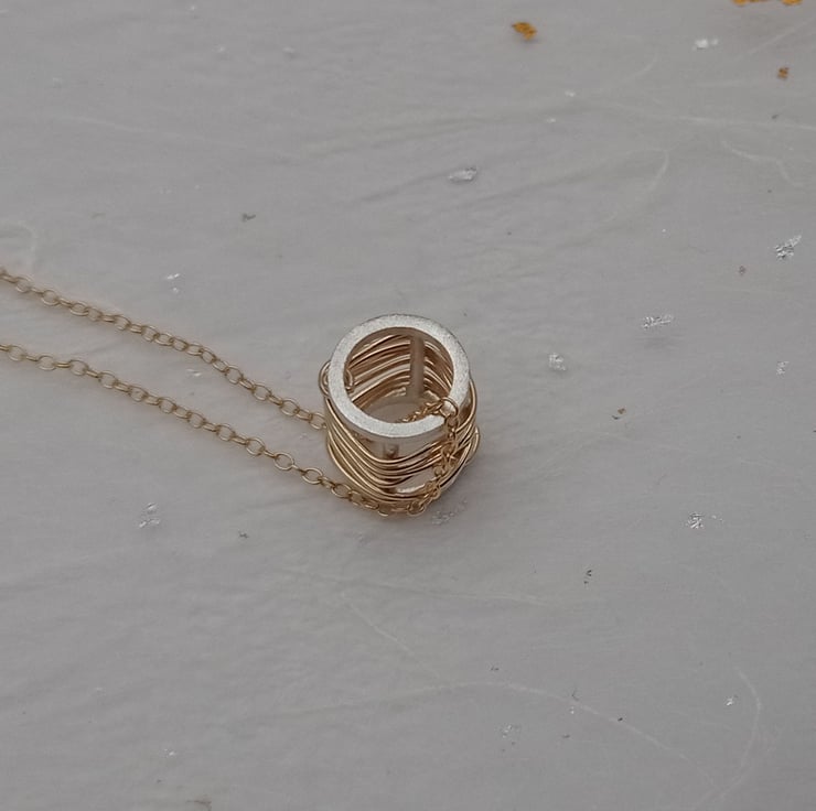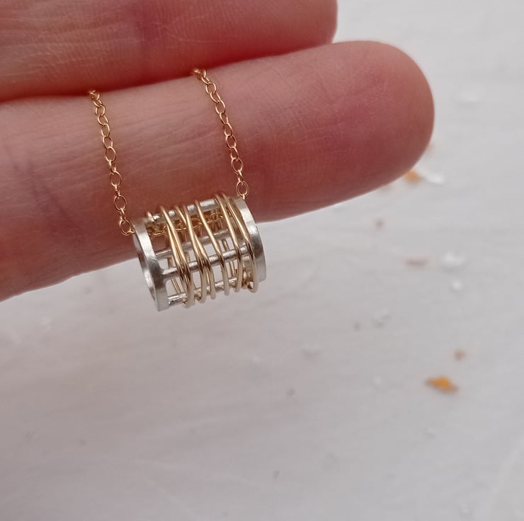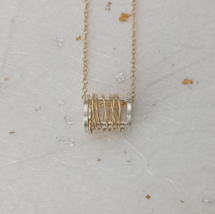 I have created this necklace by making a barrel shape with recycled sterling silver wire. After finishing, I then wrapped gold filled wire around the barrel and finished with a 16” filled gold chain. (The gold filled wire has been created by mechanically bonding a layer of 14ct gold to a layer of base metal). It has been designed by myself and is part of a small collection of similar necklaces.
