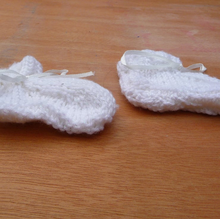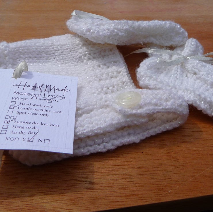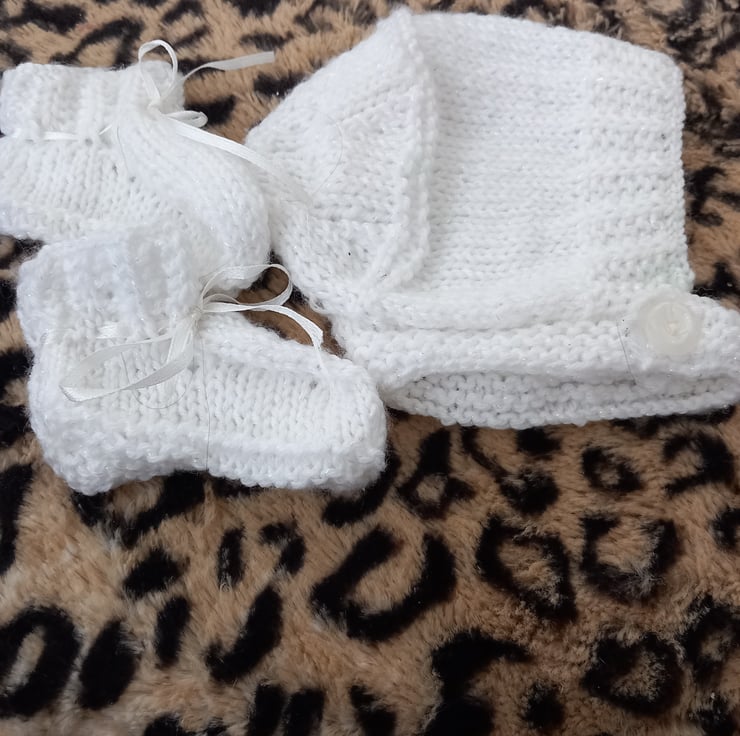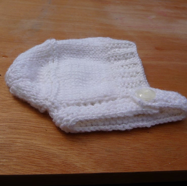 This balaclava helmet style hat is hand knitted using acrylic wool with a sparrkle running through it and fastened by way of a button tab under the chin. The hat measures 12 inches diameter at the widest point. To fit 0-3 months size.. comes with matching booties. Can be made in other colours and sizes. Please message me for details. ideal baby shower or new baby gift