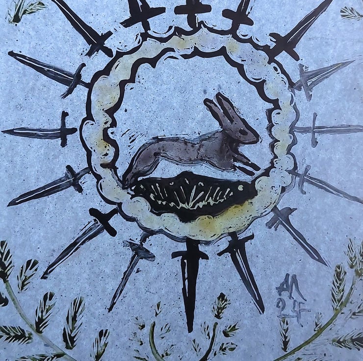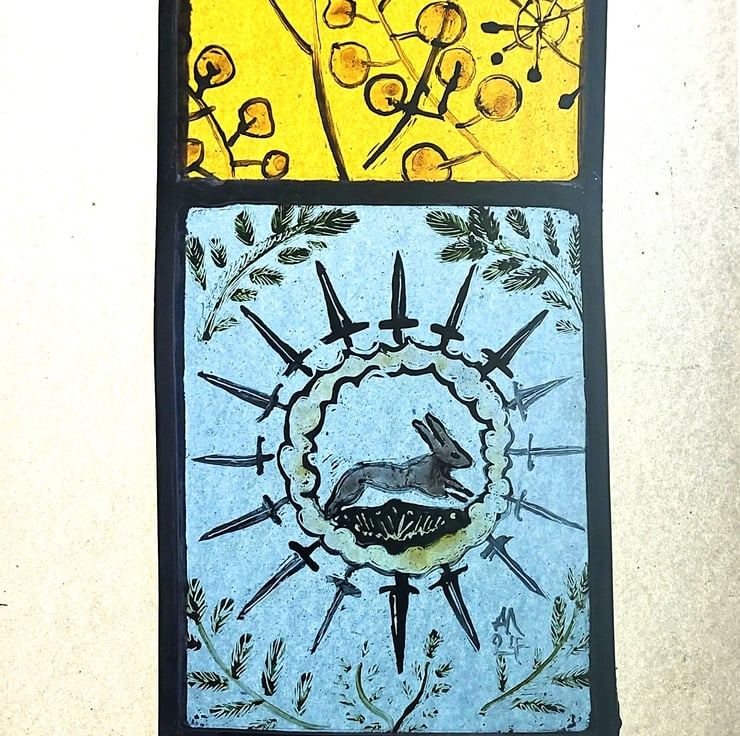 I am greatly inspired by the natural world and folklore, which had led to me enjoy the imagery of tarot cards. This little panel celebrates new starts, fresh beginnings, spring and the monthly cycle.