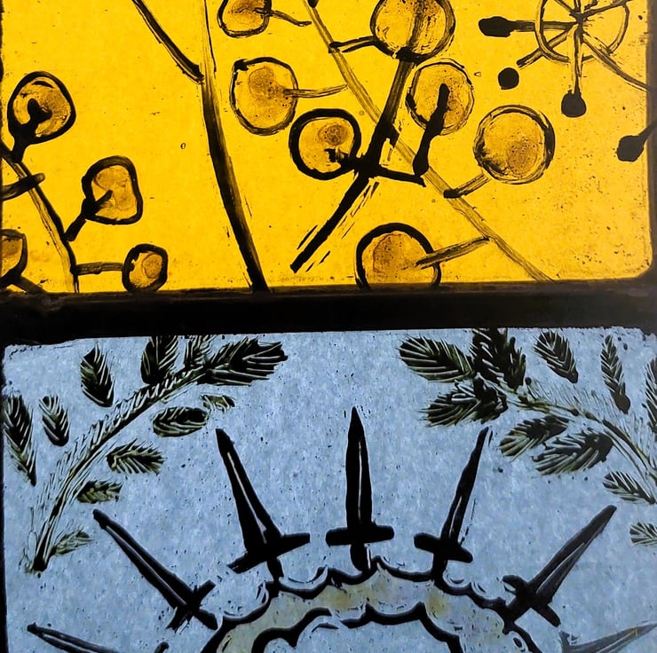 I have painted this panel in traditional kiln fired enamels and then leaded using traditional leading techniques.