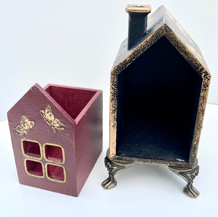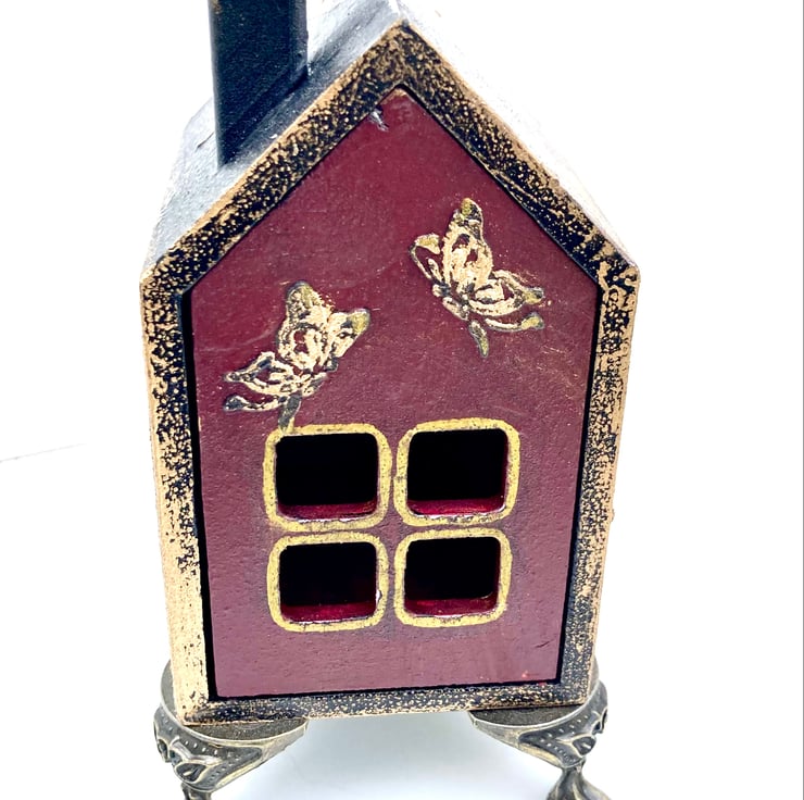 The front part of the box is a very dark almost maroon red with gold motif butterflies. the roof has a hand made chimney printed out on a 3d printer, also black and gilded
