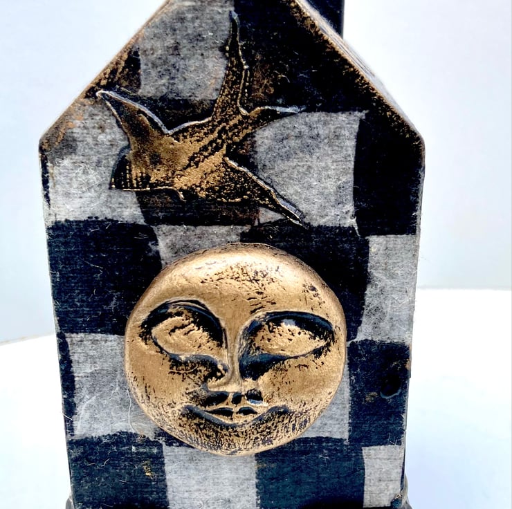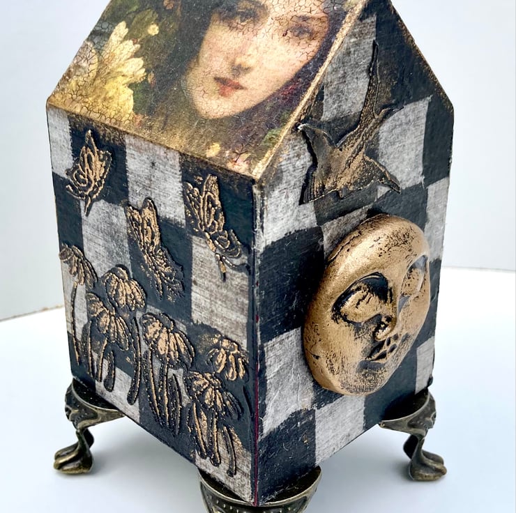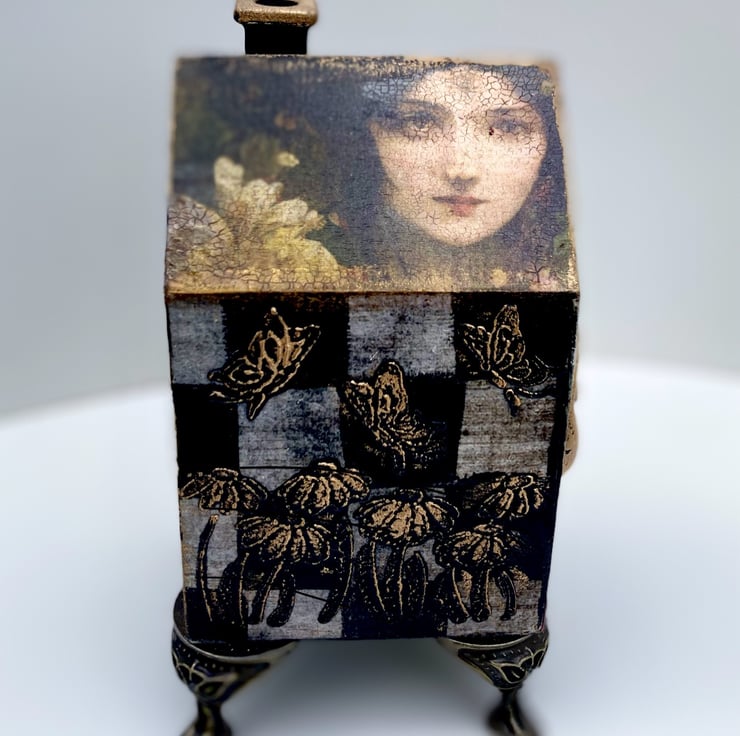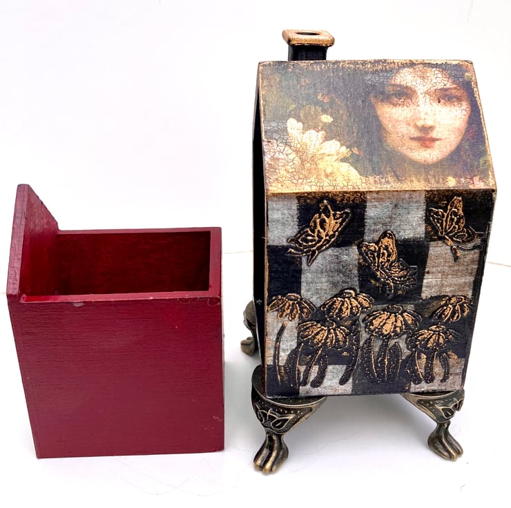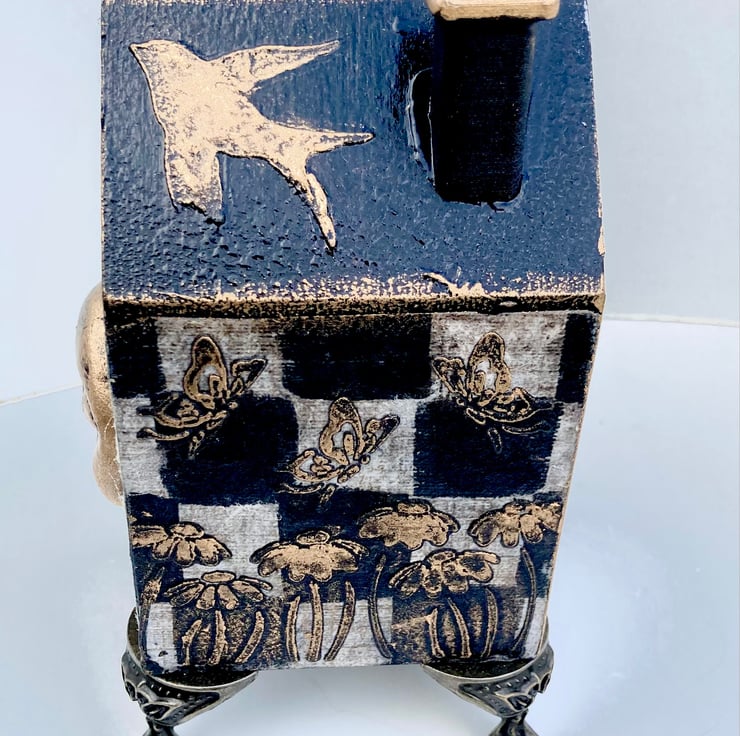 The box is decoupaged, gilded, varnished, hand painted, it has a smiling moon hand crafted from clay on the back,this has been painted black then gilded with gold, it has raised flowers and butterflies and swallows created using a special artist modelling paste which give a raised textured motif. These have also been finished with gold gilt over black paste.