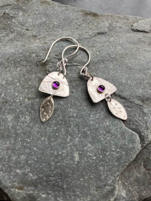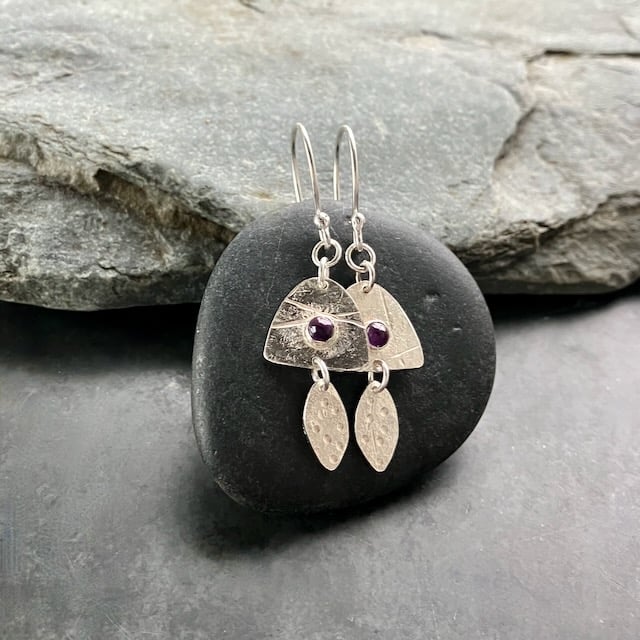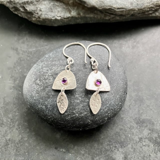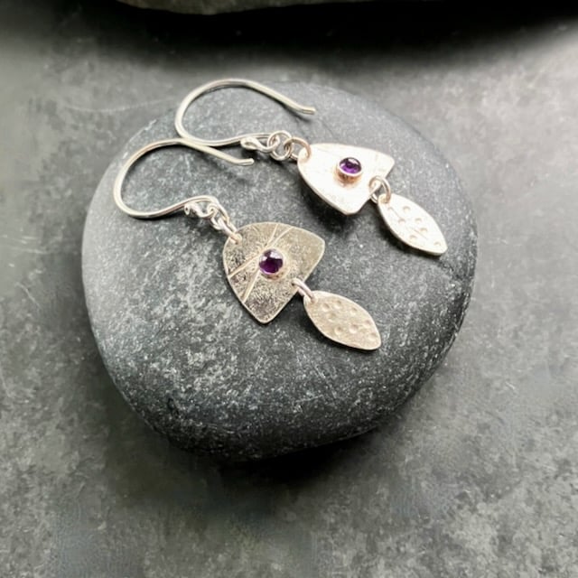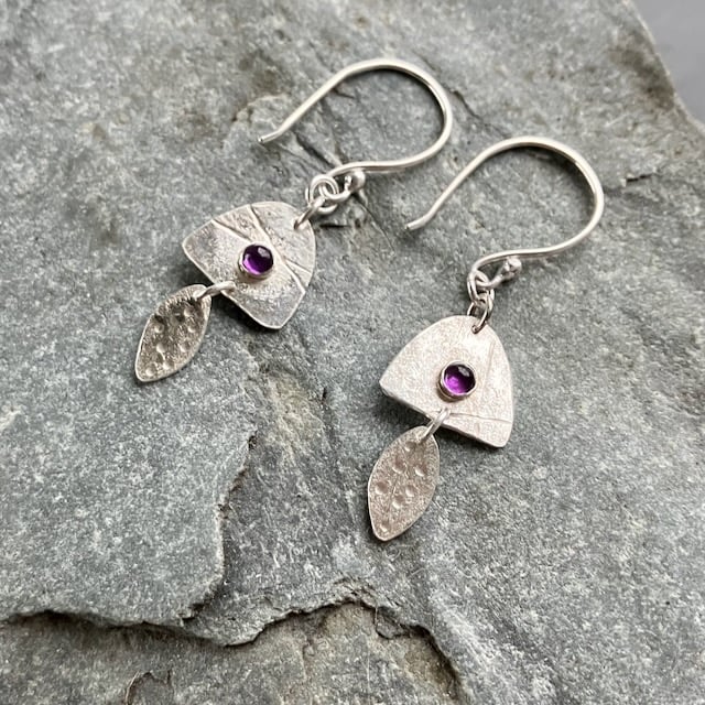 Dainty and lightweight these dangle earrings are made from sterling silver with 3mm amethyst cabochons. I have textured the silver with hammer and a rolling mill and then pierced arch shapes. A little leaf shape decorated with dots hangs from the centre of each of the arches.