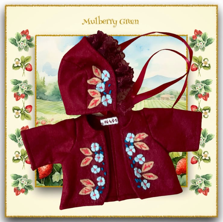 A beautiful little hand embroidered jacket and matching bonnet to fit the Mulberry Green dolls. The jacket is in a lovely deep claret and is embroidered with tiny duck egg blue flowers. The matching bonnet is trimmed with claret lace and fastens with a satin bow. A really unusual one set.