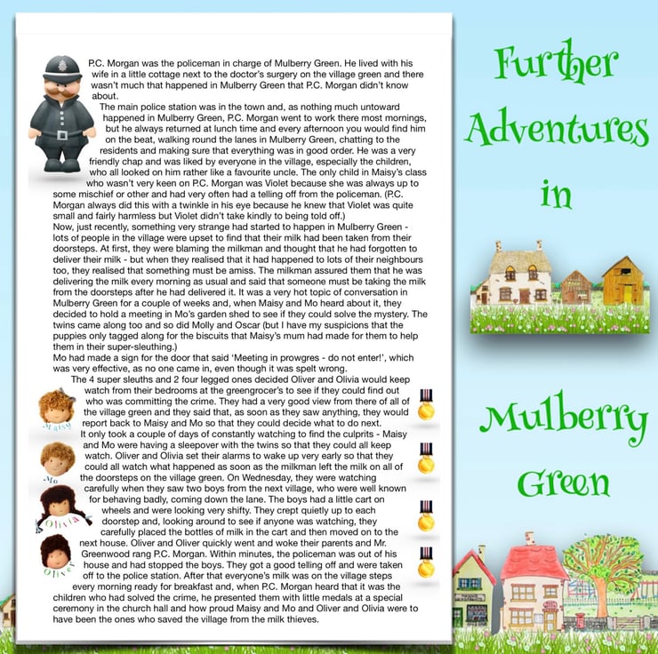 There are other children in Maisy’s class at school - Violet, Billy with his pet rabbit, Amber, Tilly, Rosie and her kittens, Amelia, Ruby, Marigold, Bobby with Max the dog, and the twins Oliver and Olivia, who have a puppy called Oscar. The dolls are all 26cm tall and baby Daisy is 16cm. Maisy and Mo love nothing more than having adventures with their friends. You can read about their adventures on my Facebook and Instagram pages - Maisy Muffin Rag Dolls and on my Mulberry Green Pinterest boards.