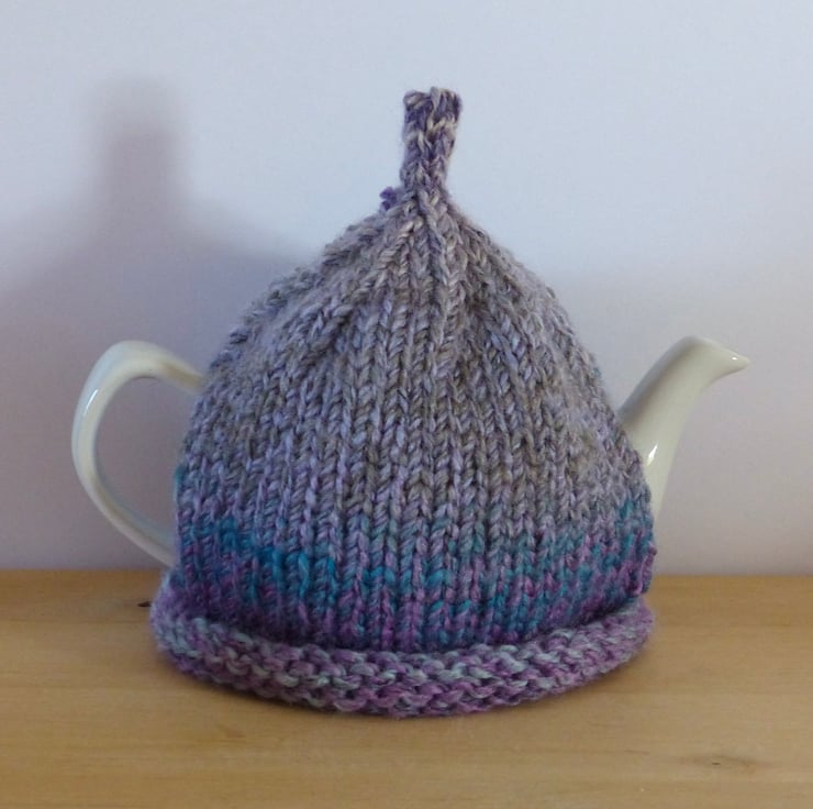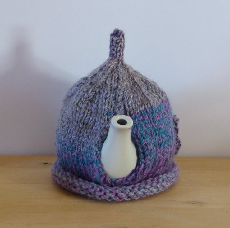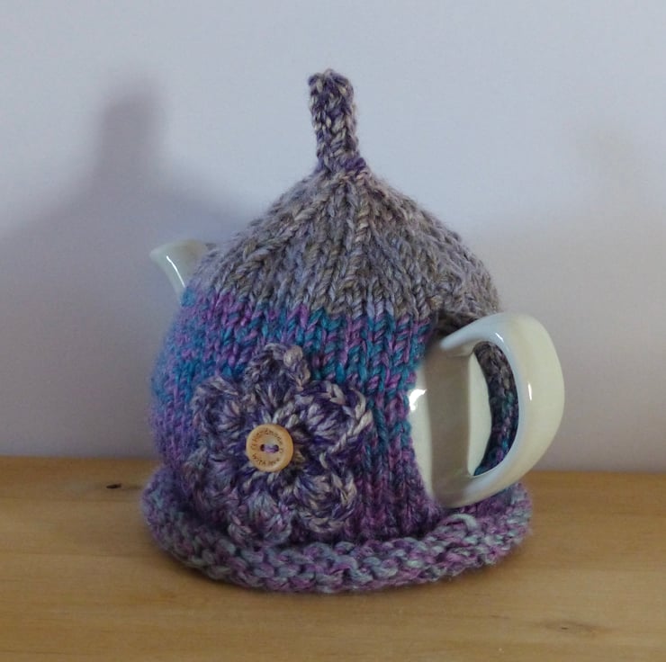 A hand knitted Tea Cosy in a chunky variegated yarn in shades of Blue and Purple. It has a 'pixie' top and a crocheted flower in the same yarn as the cosy on the front for decoration with a natural wood button with the words 'Handmade With Love' in the centre.