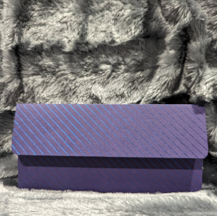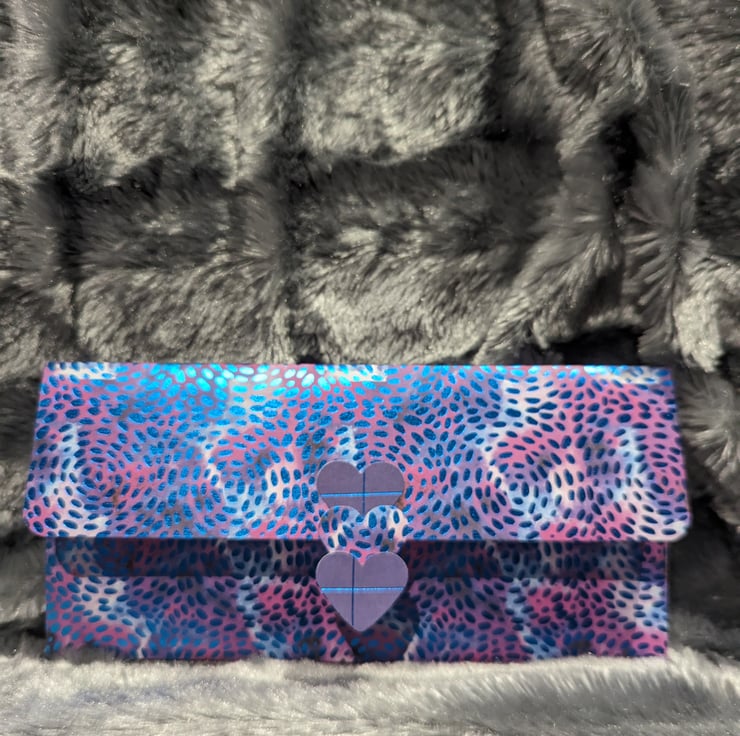 1. Metallic animal print blue, purple and white pattern with a faux closure of 3 hearts in alternating card
