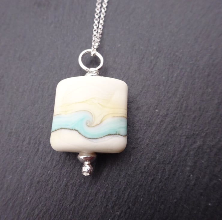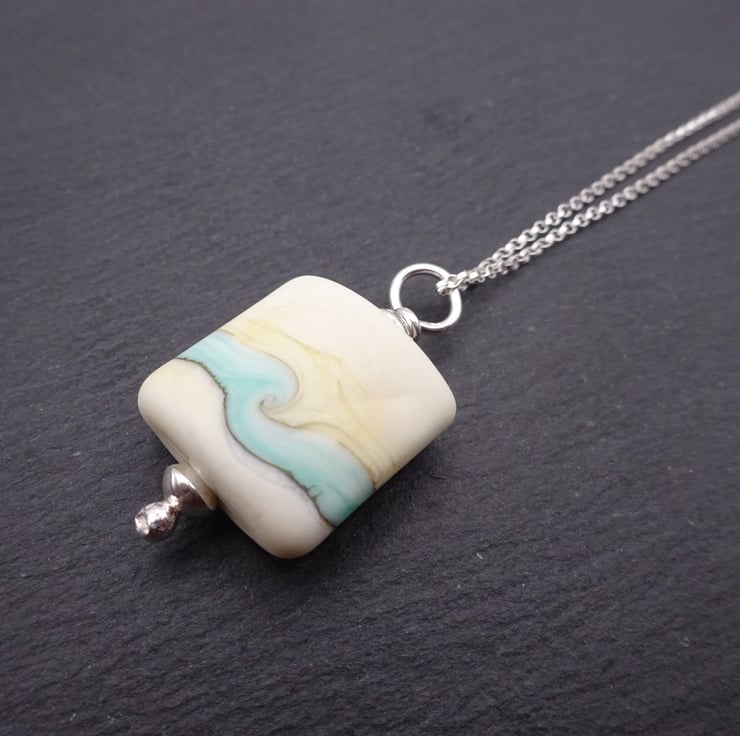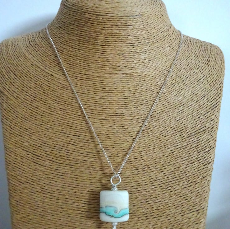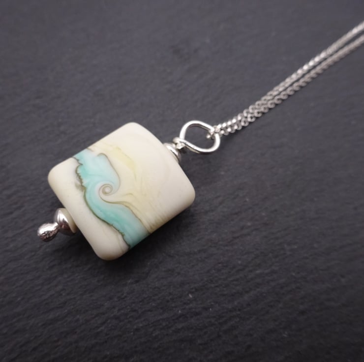 The lampwork glass pendant has been handmade by me using ivory and green glass, it has been shaped and tumbled to give a smooth finish.