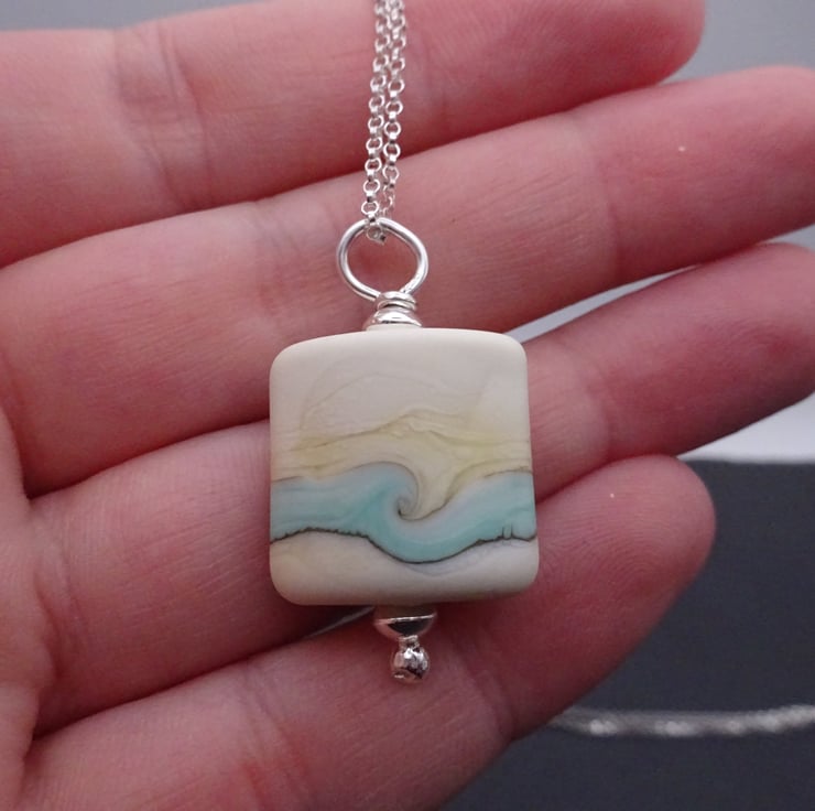 A sterling silver chain which features a handmade lampwork glass pendant.