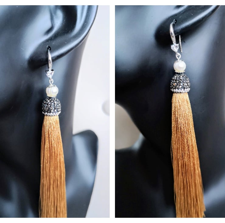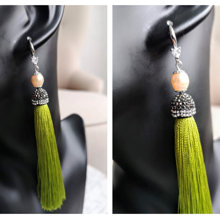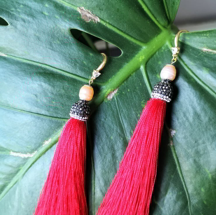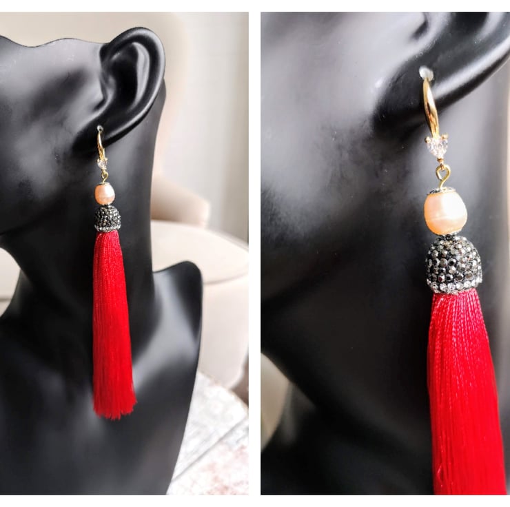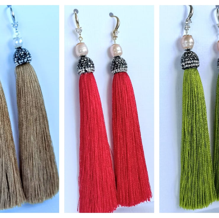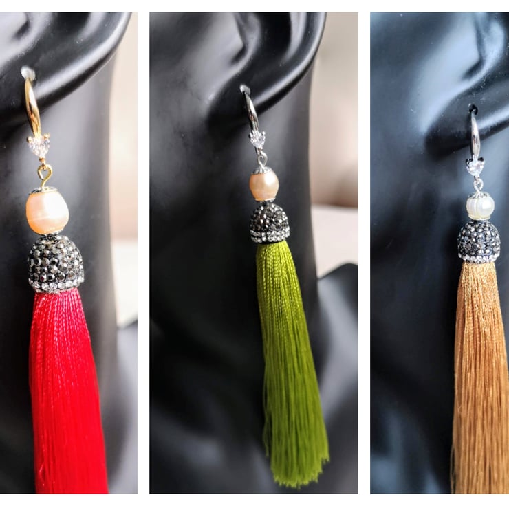 These lovely tassel earrings made with soft and silky viscose thread, in bright red, beige and light green colours, decorated with Freshwater pearls. Gold and silver plated findings were used.