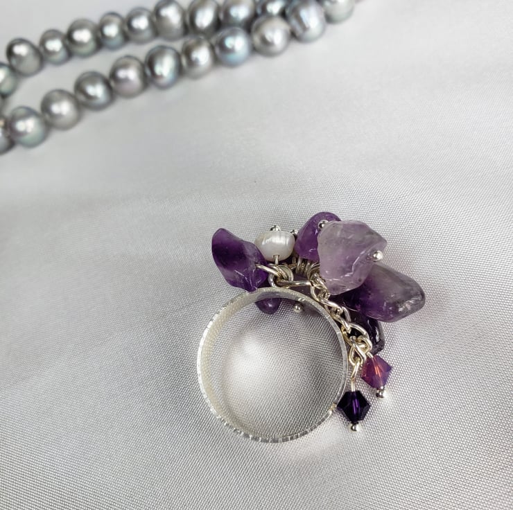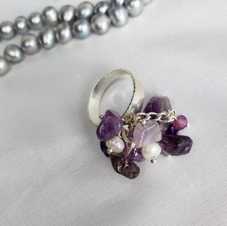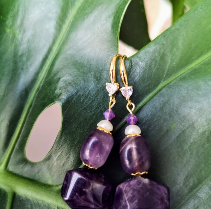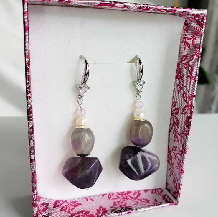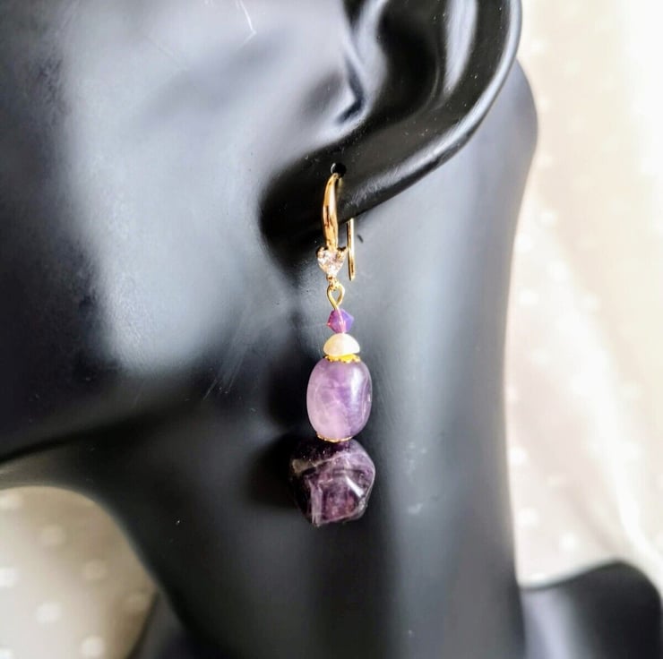 These beautiful earrings were designed and made by me using Amethyst gemstone, freshwater pearls and Swarovski crystals.