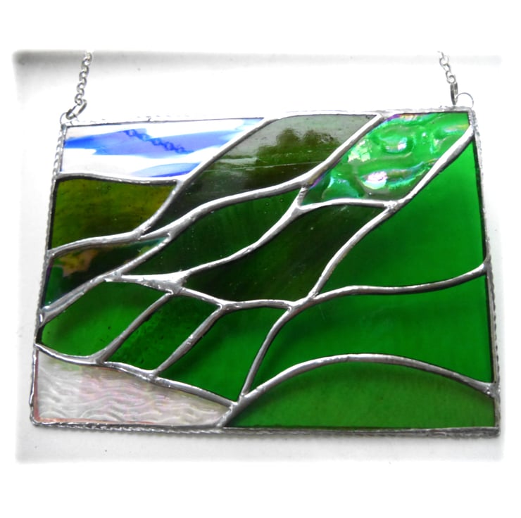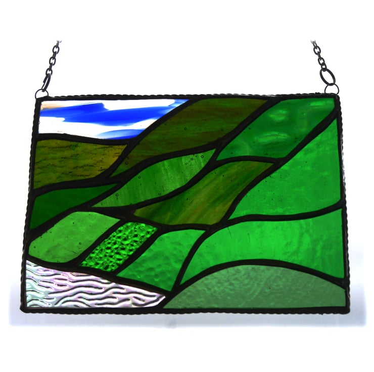 I've tried to pick out the Scottish highland heather colouring with purple and green streaked glass and I've used clear, iridescent glass for the sea and added some streaks of blue to the sky as this is a sunny day in Scotland.