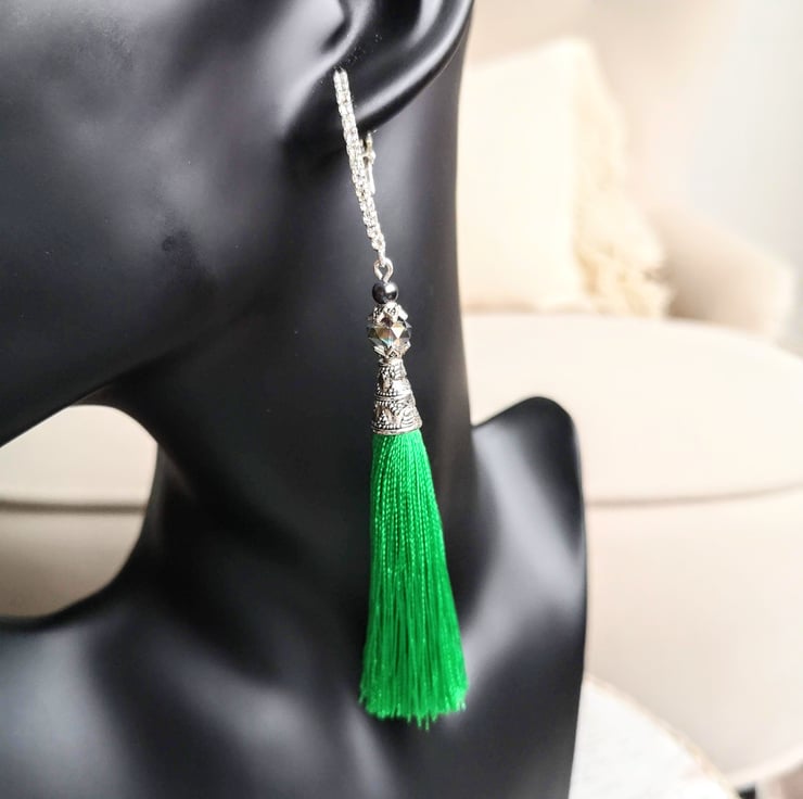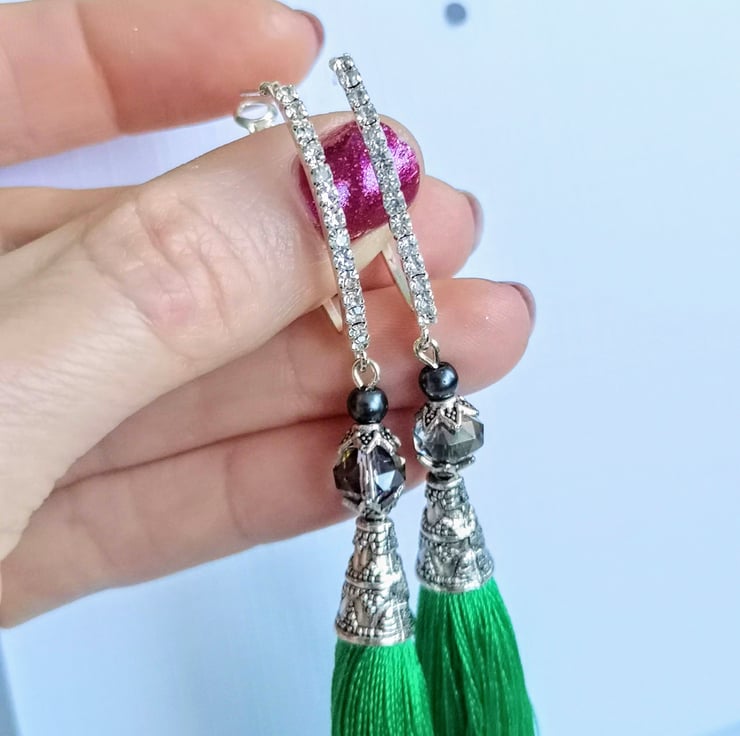 Green Tassel Earrings Rhinestone Handmade Jewellery