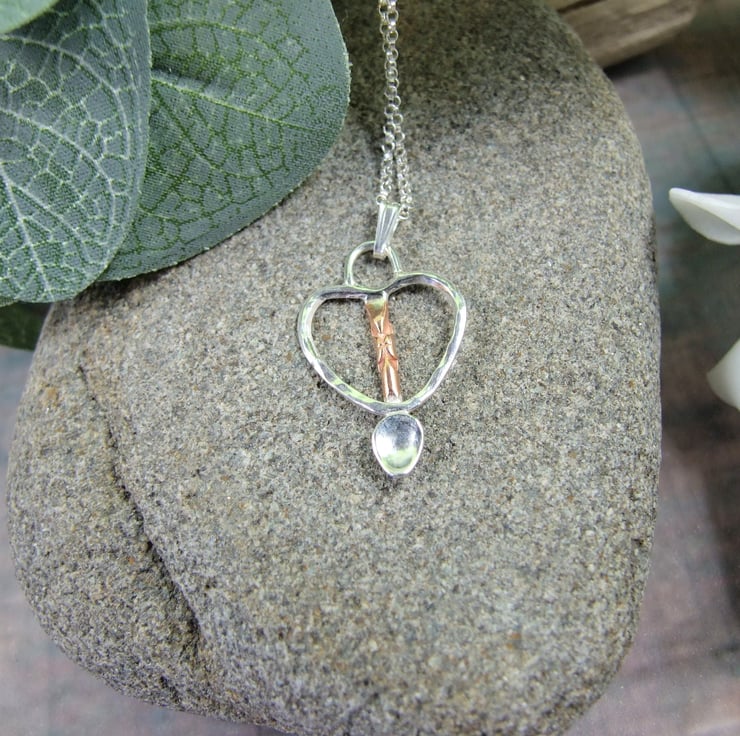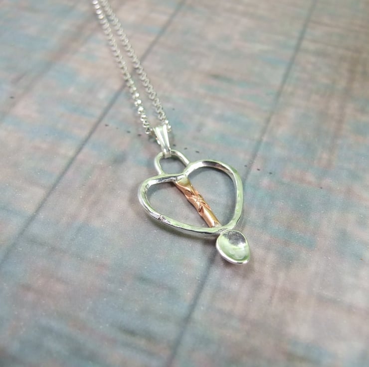 Welsh Love Spoon Pendant. Sterling Silver and Copper Necklace. 7th Wedding Anniversary Gift.