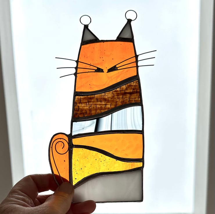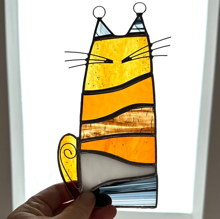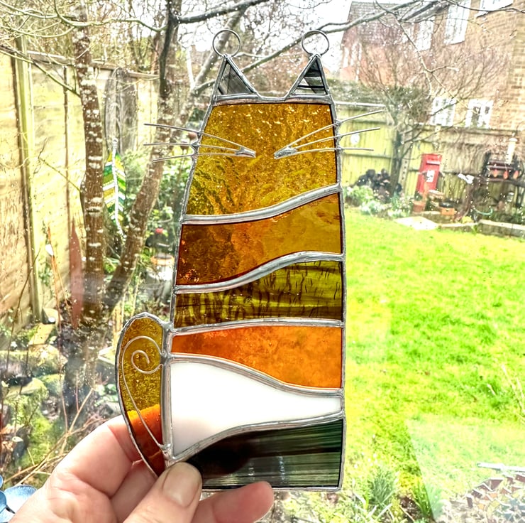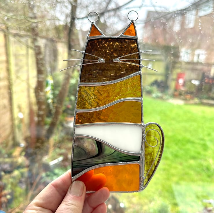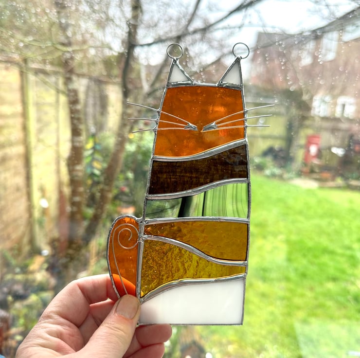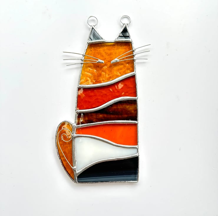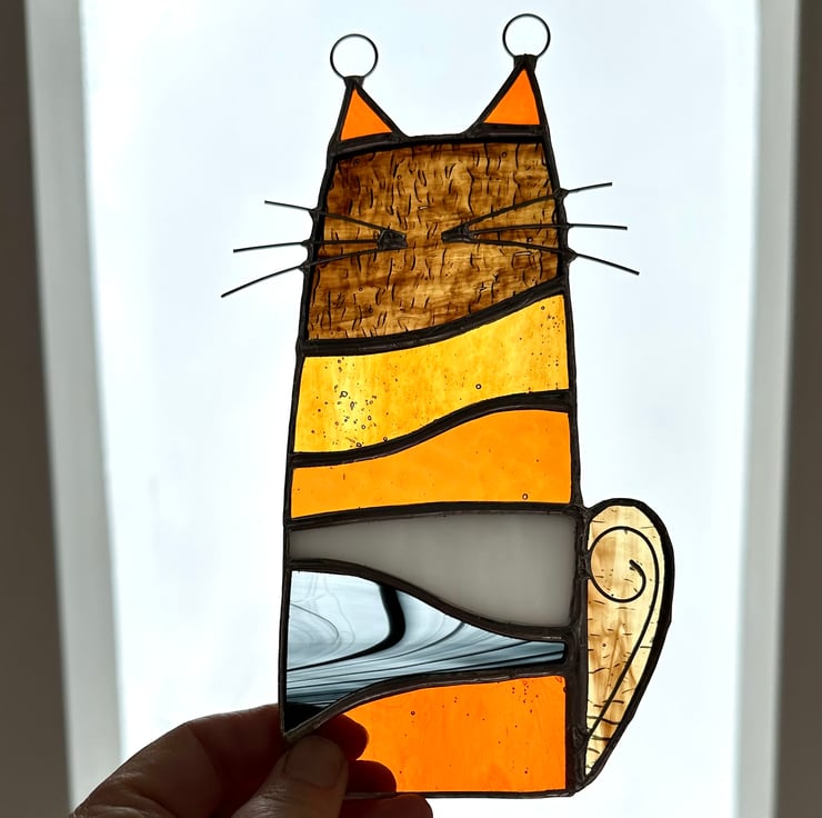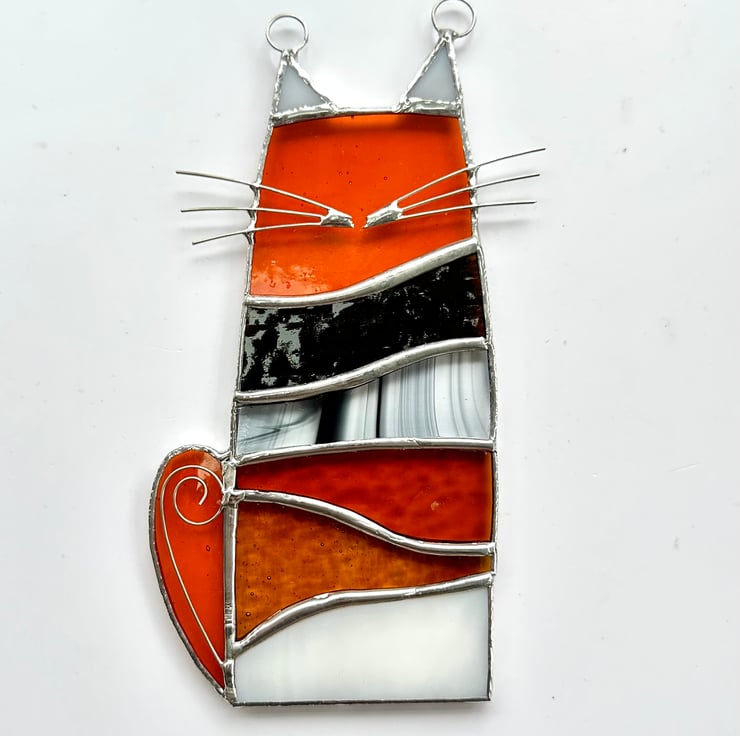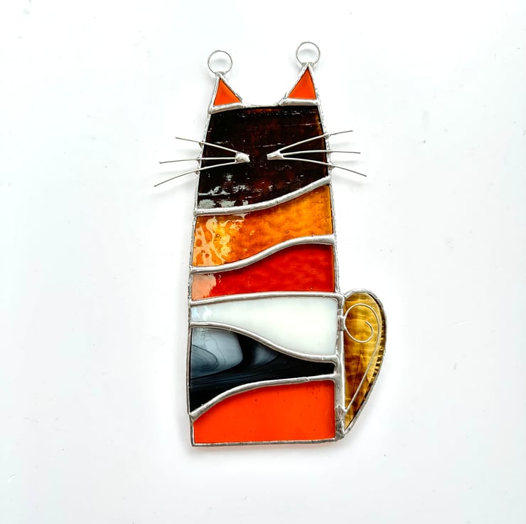 Each piece of glass has been cut by hand, ground, washed, foiled and soldered together before being washed again. The whiskers and tail curl have been made from tinned wire. Two rings and a length of fishing line have been added for hanging purposes.