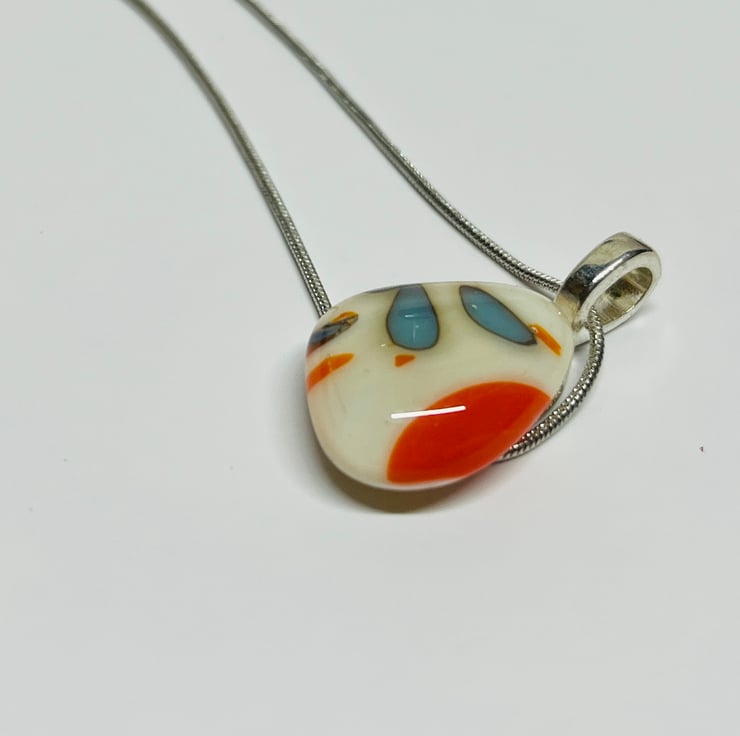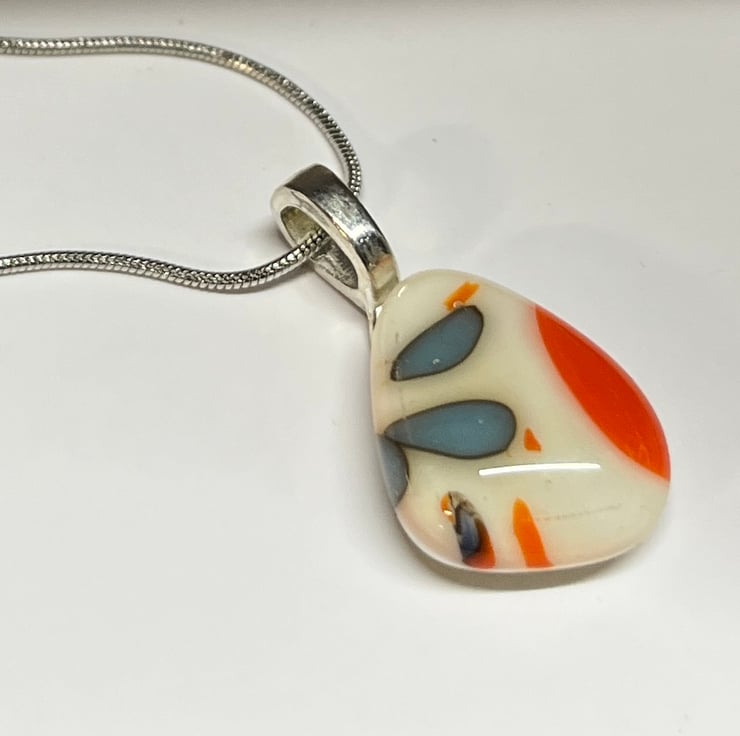 Elevate your style with this stunning handmade glass fused pendant, featuring a blend of white, blue and orange hues, taken from the colours of the sunset. Adorned with an 18" sterling silver chain, this piece adds a unique pop of colour and sophistication to any outfit.