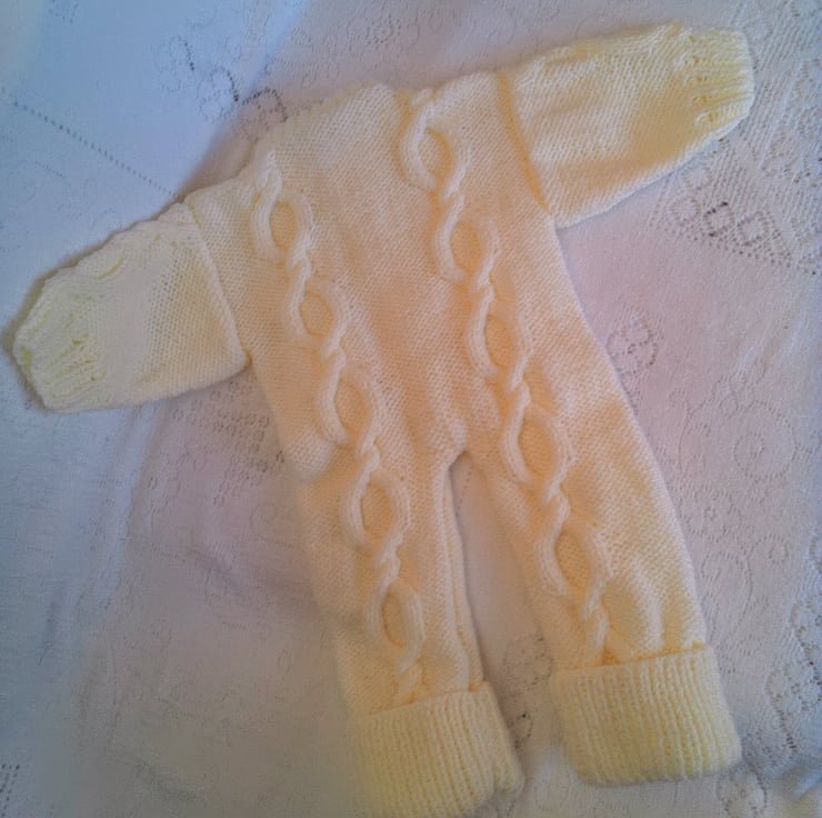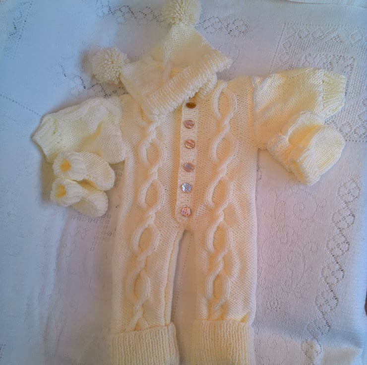 Cabled Outdoor Outfit for Baby, Prem Sizes Available, Custom Make, Knitted Baby Outfit, Baby Layette, Baby All in One, Baby's Hat, Baby's Mittens, Baby Booties, New Baby Gift, Baby Shower Gift