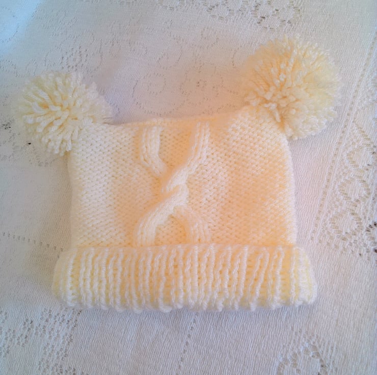 The outfit would make an ideal gift for a baby shower, a new baby or as a Christening gift. It would also make a lovely gift for a new premature baby. The set comprises a cabled All in One, a pom pom hat, a pair of mittens & a pair of booties. It is in stock in the cream colour shown, to fit a newborn baby with a 14 inch chest. The all in one is fastened at the front by 6 pretty shell buttons and the hat has two fluffy cream pom poms at the top corners.