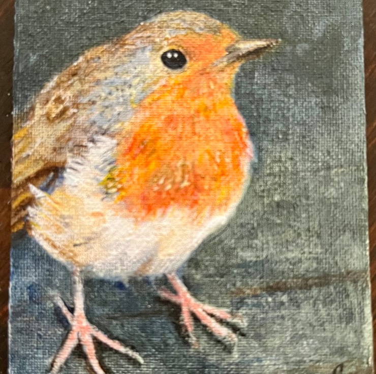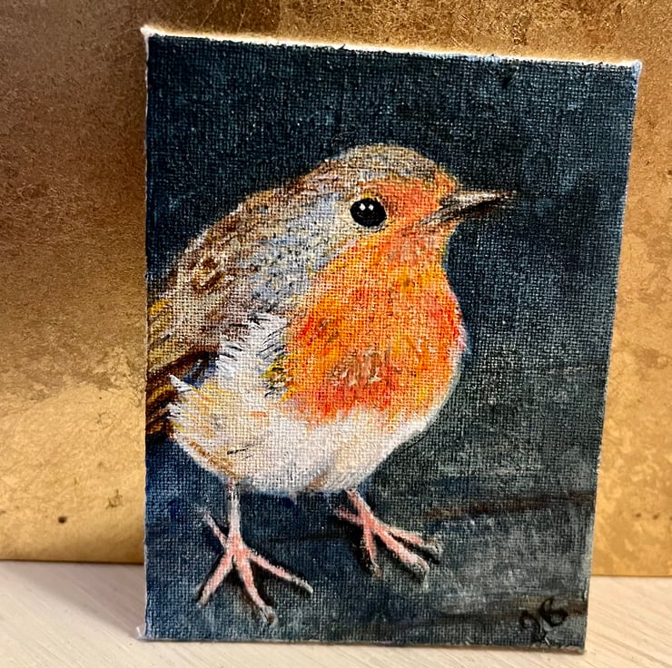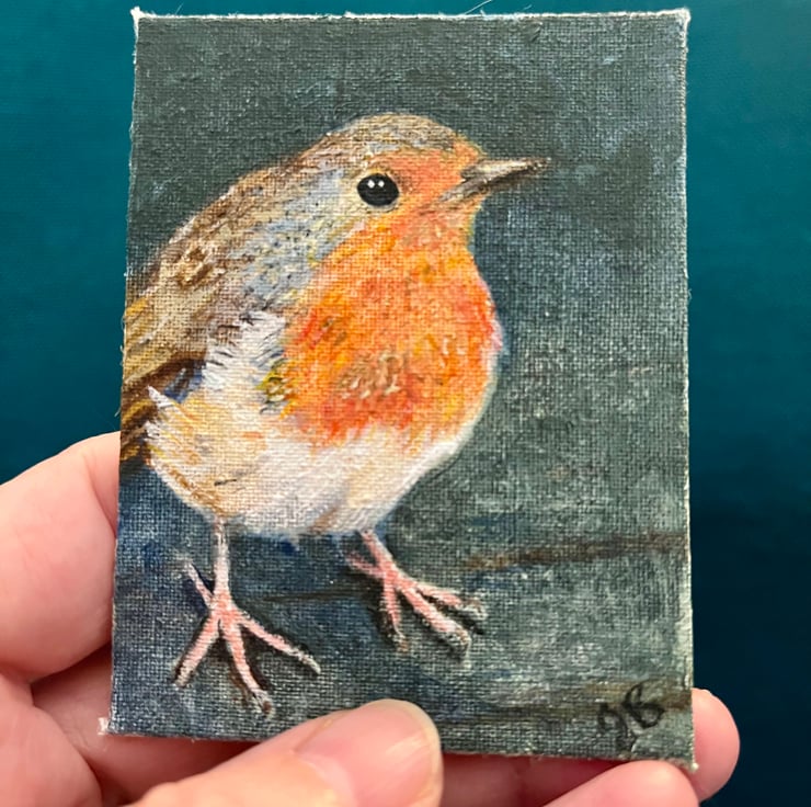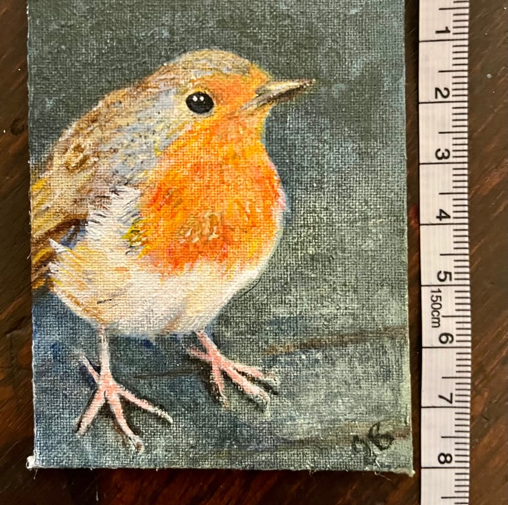 Measuring 8x6cm this is a tiny portrait of a robin.