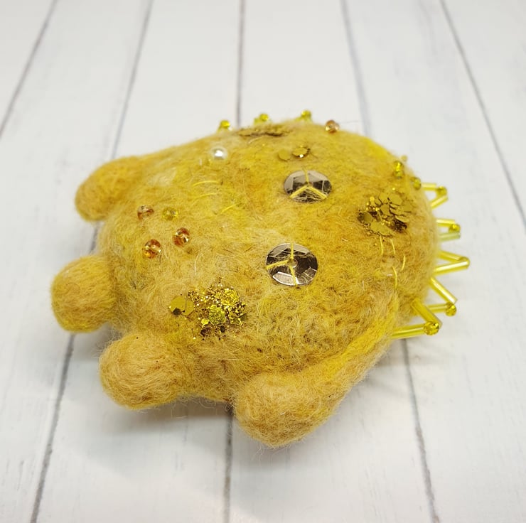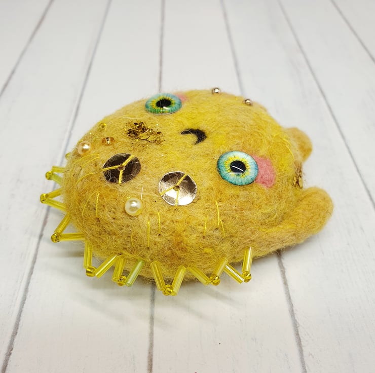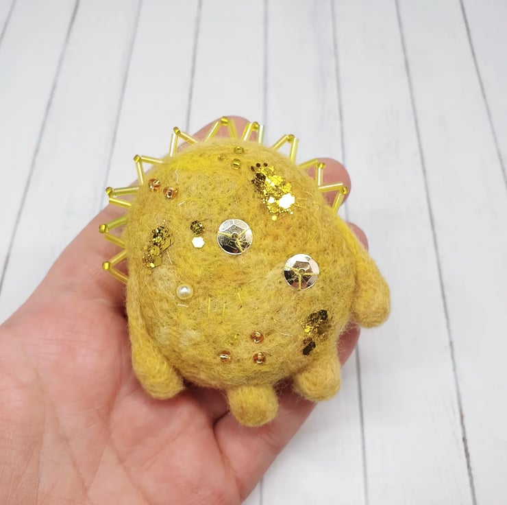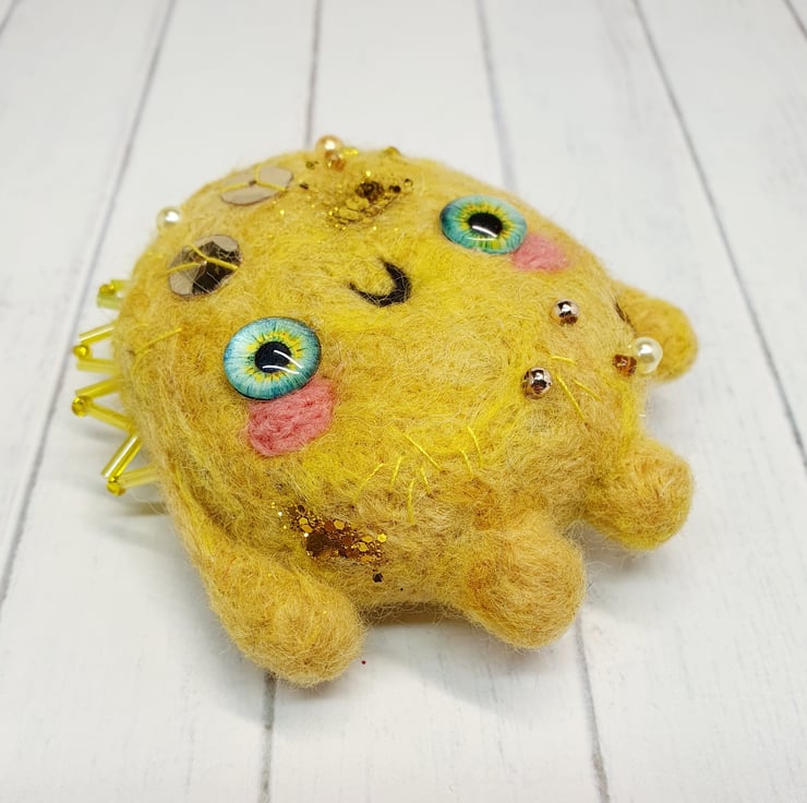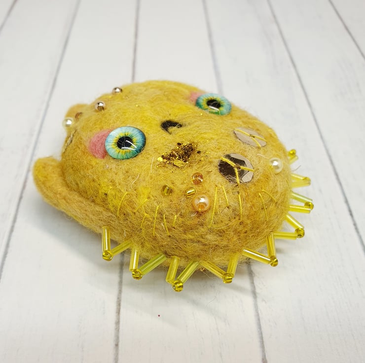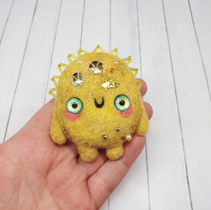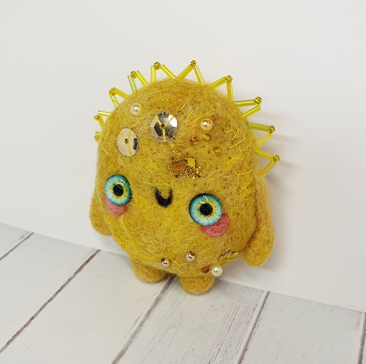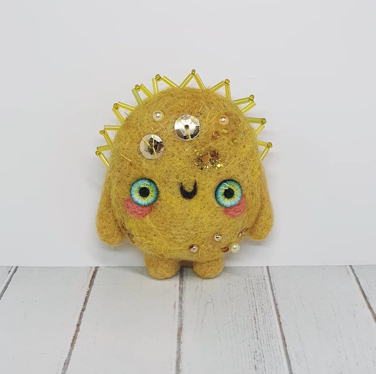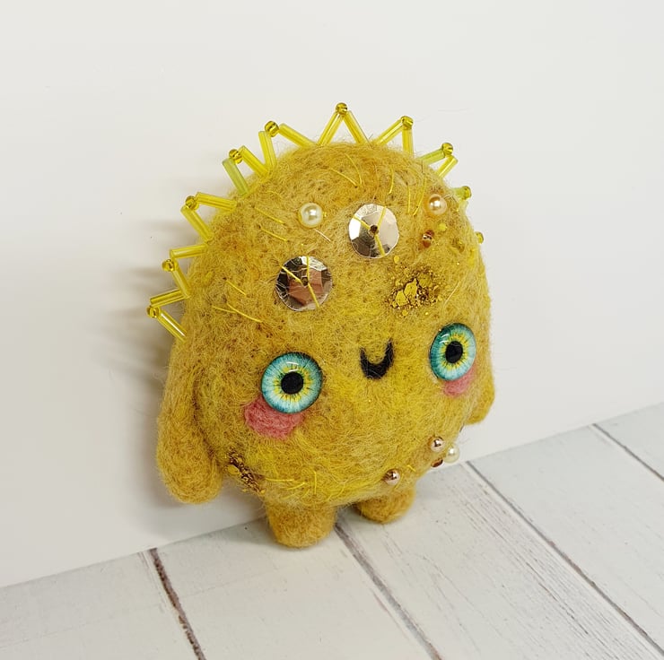 Needlefelted miniature Art Doll with glass eyes and hand sewn beads. This doll is decorated with hand embroidery and new and upcycled beads. There are also patches of gold chunky glitter, sequins and beads around the head to represent sun rays. This is for decorative purposes only and not a toy. Measures roughly 8cm tall and 6.5cm across.