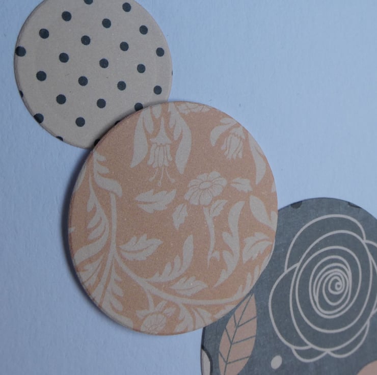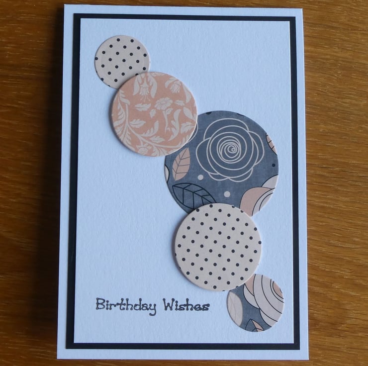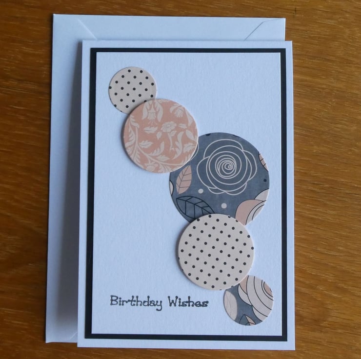 This simple Birthday card has circles of floral, leaves and polka dot pattered papers in shades of peach, grey & black and the message 'Birthday Wishes'.