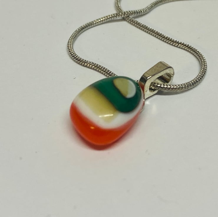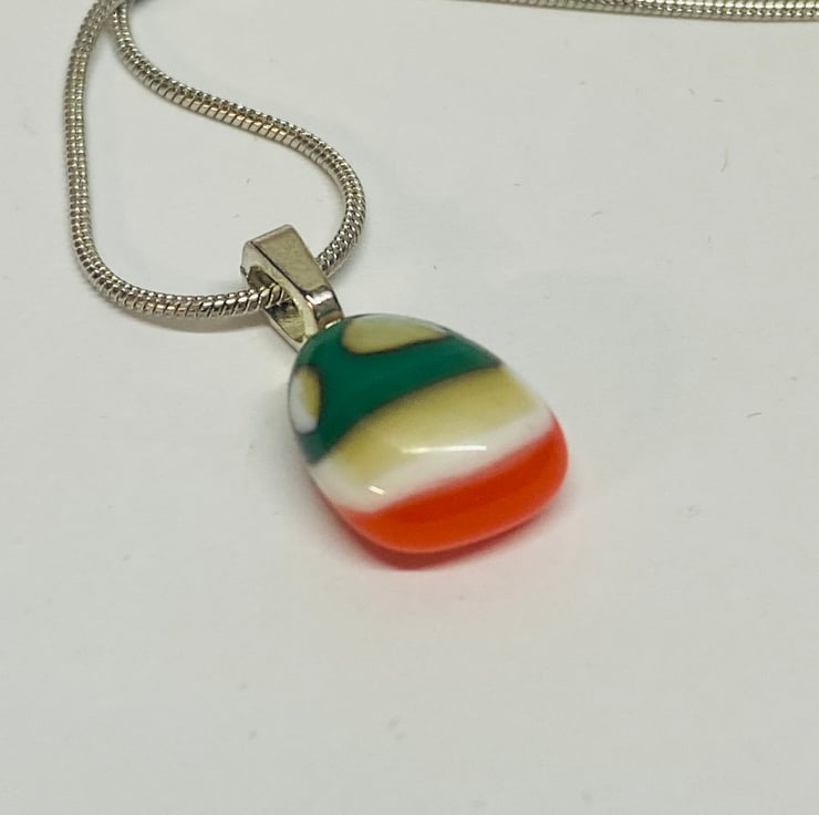 This pendant shows a symphony of cream, green and orange hues crafted to perfection. Each pendnant is a testament to artisanal skill and creativity, showcasing a unique blend of colours that will elevate any outfit. Handmade with care and attention to detail, it's the perfect accessory for those who appreciate artistic beauty.