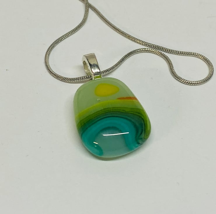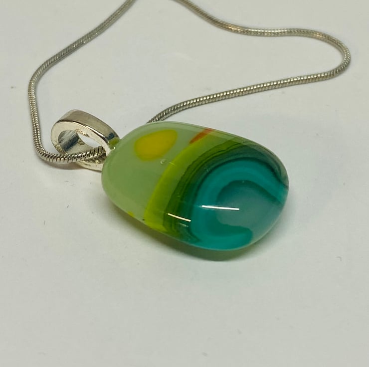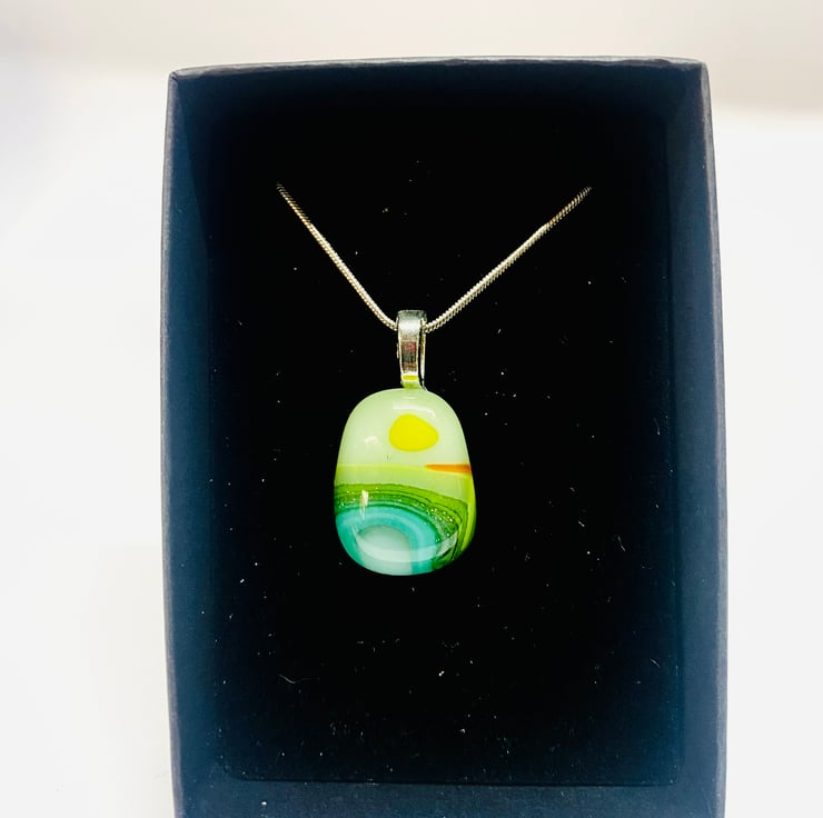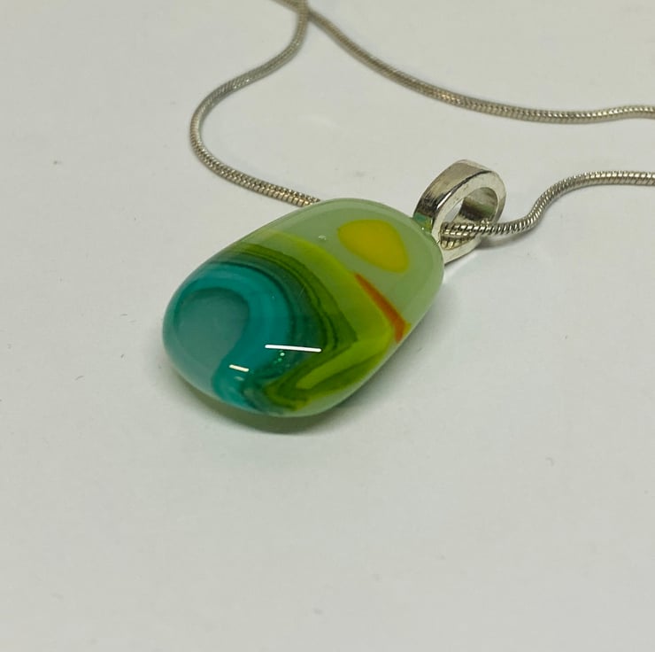 Immerse yorself in a burst of vibrant colours with my exquisite handmade glass fused necklace. This stunning piece features a harmonious blend of green, yellow, orange and blue hues, crafted to create a captivating visual symphony.