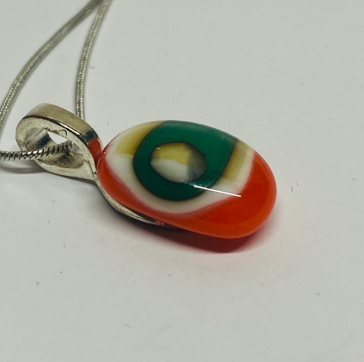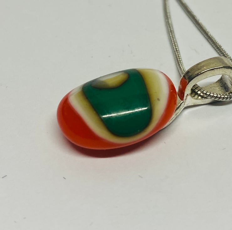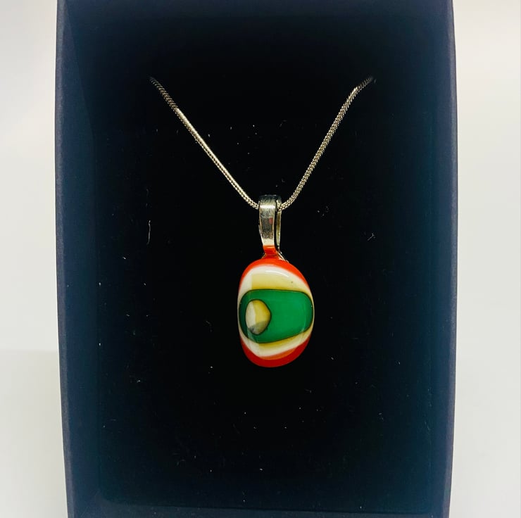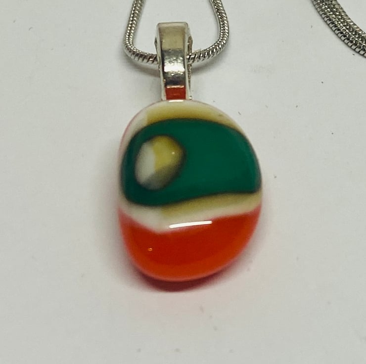 This pendant shows a symphony of cream, green and orange hues crafted to perfection. Each pendnant is a testament to artisanal skill and creativity, showcasing a unique blend of colours that will elevate any outfit. Handmade with care and attention to detail, it's the perfect accessory for those who appreciate artistic beauty.