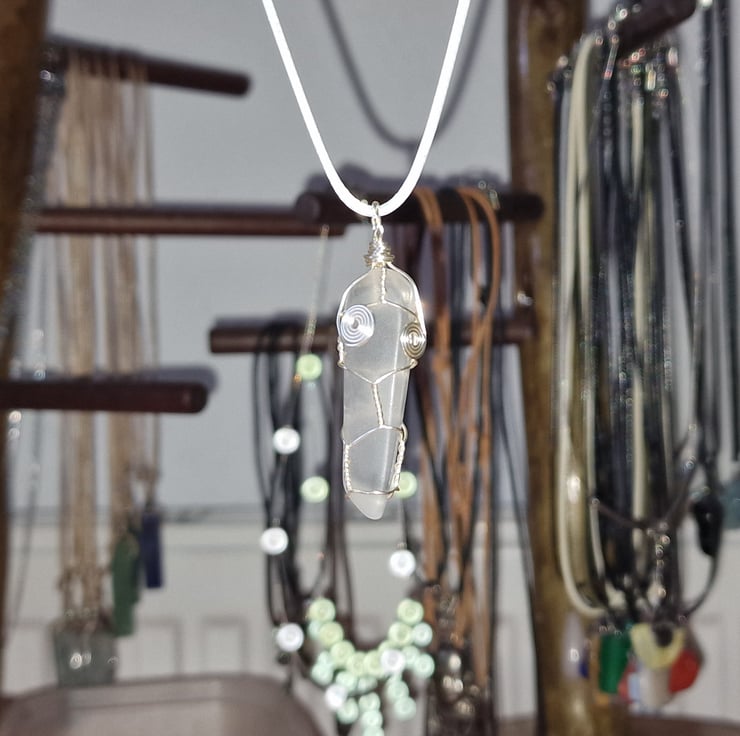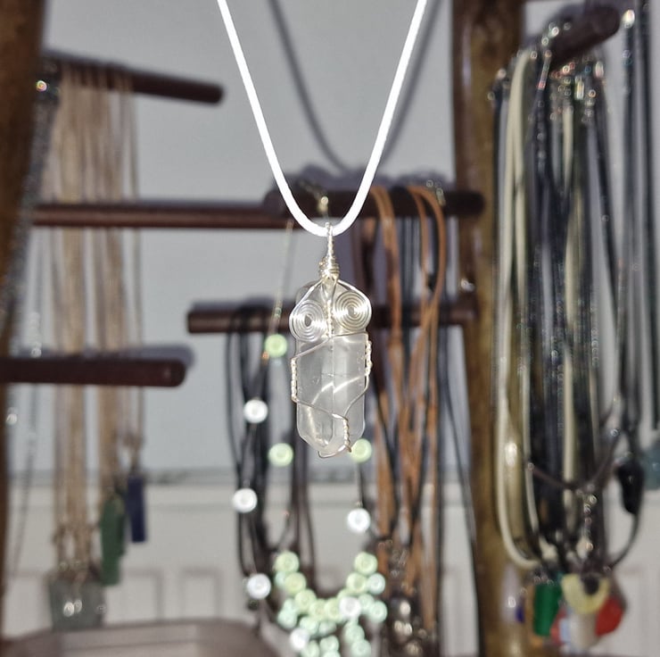 Clear quartz hand cut and polished. Wrapped in a permanent silver colour tarnish resistant silver stainless Steel wire.