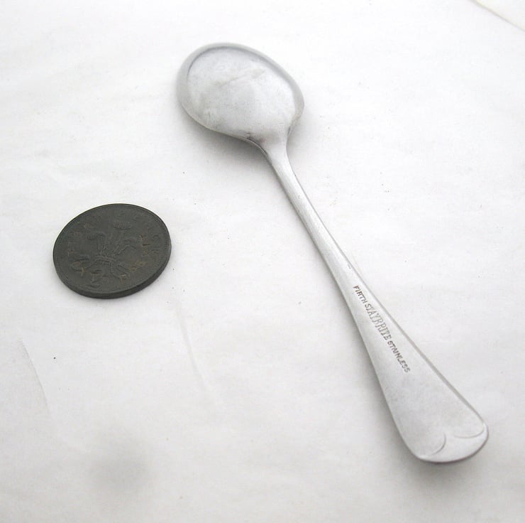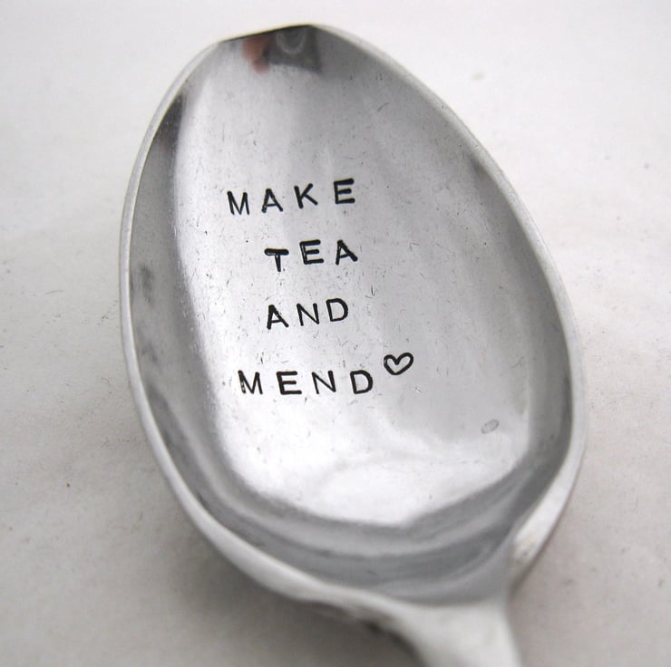 A vintage stainless steel teaspoon hand stamped with MAKE TEA AND MEND and a tiny heart. It's a plain 'old english' spoon, a little worn at the end, approx. 14cm long. This is an unusual piece for me as generally stainless steel is too hard for stamping by hand - I was delighted to find that this particular spoon was stamp-able! So for once there is no tarnish although there are wear marks. I'm guessing the date of manufacture is 1930s to 1940s.