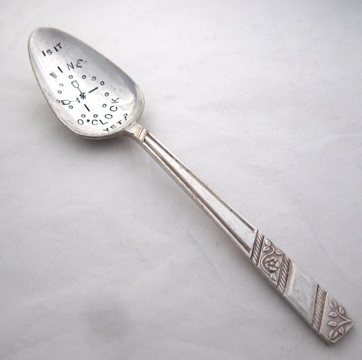The important question: is it wine o'clock yet? I've stamped it into a vintage spoon that will go in the neck of a bottle of fizz and supposedly (I make no claims) slow down the process of going flat. There are two wineglass icons pointing to around nine o'clock on a sort-of clock face made out of bubbles.