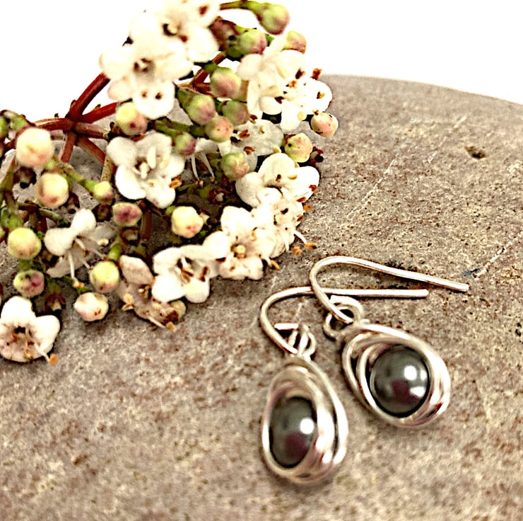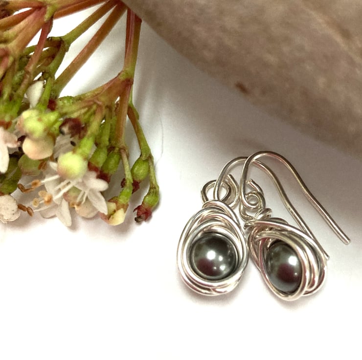 These pretty earrings have been created from sterling silver wire, using a herringbone wire wrapping technique and grey Swarovski pearl beads. They have hand crafted sterling silver fittings.