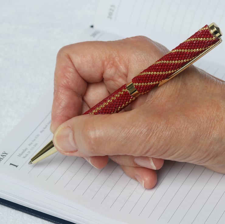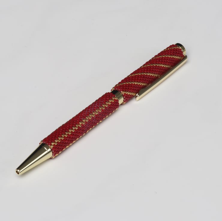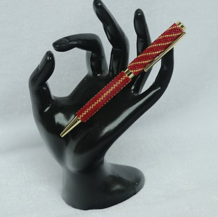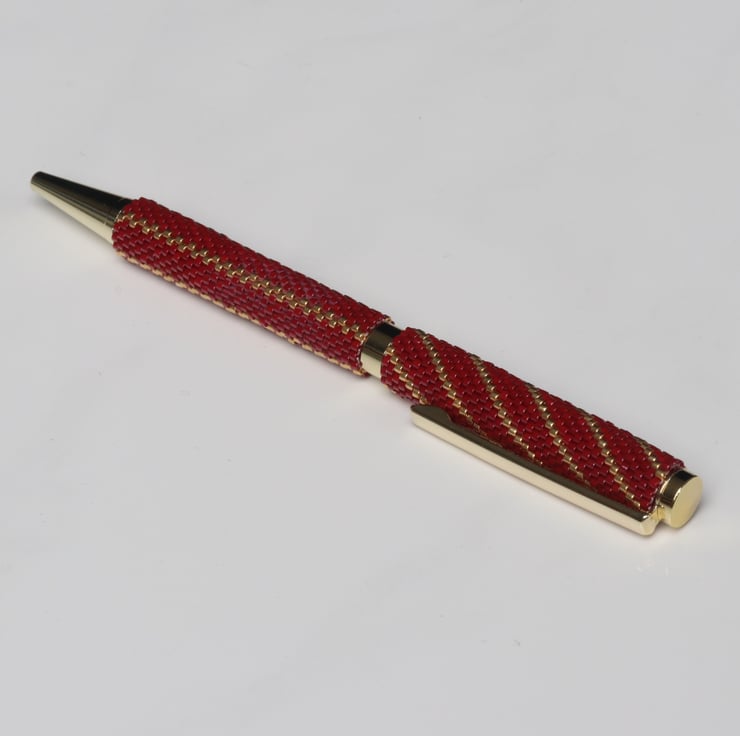 This elegant ballpoint pen, with a gold plated clip, has a minimalist beadwork design; slender gold stripes set against a dark red background. Its retractable ballpoint insert is accessed by twisting the top portion of the pen and can be replaced with a new refill when the ink runs dry.