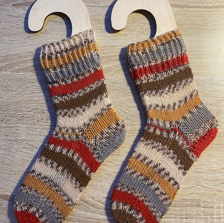 Hand knitted, non-itchy child's socks - 75% wool, 25% nylon. This yarn is from the West Yorkshire Spinners and is reared, sheared and spun in Britain. It contains 35% Bluefaced Leicester wool and is space dyed to create the variegated effect - no two socks will be exactly the same. Machine washable at 30 degrees, or a handwash cycle, do not tumble dry. Length from heel turn to top is approximately 7", from heel to toe is also 7". Fits approximately age 4 to 6 years. To extend life of socks, use a washing liquid specially made for woollen items.