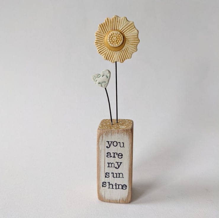 The clay sunflower is made from polymer clay. This is hand moulded and patterned, fired and painted to finish. A little clay heart, stands beside it.