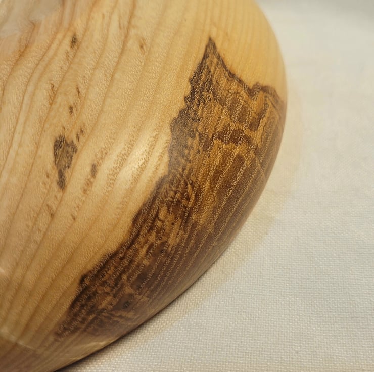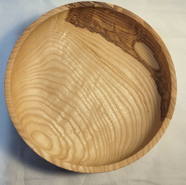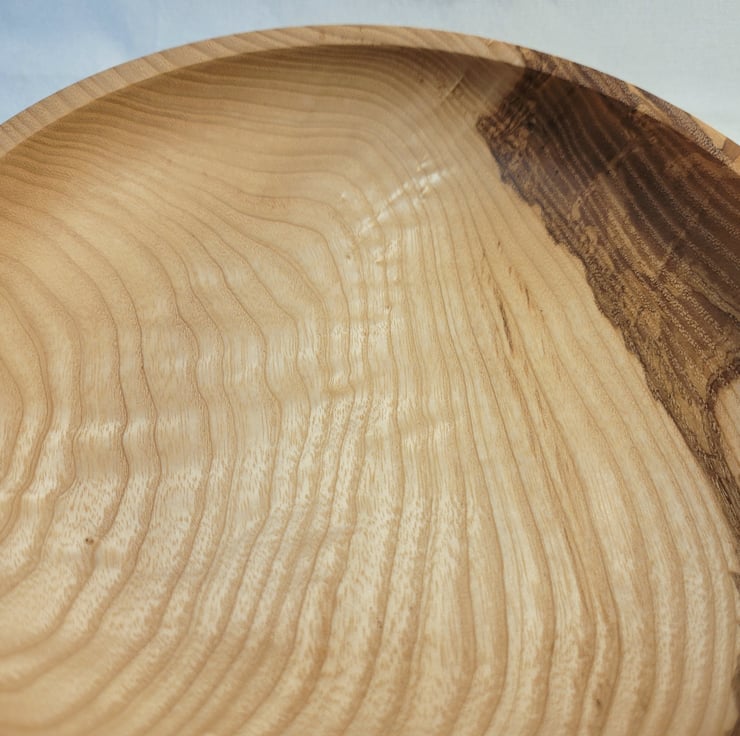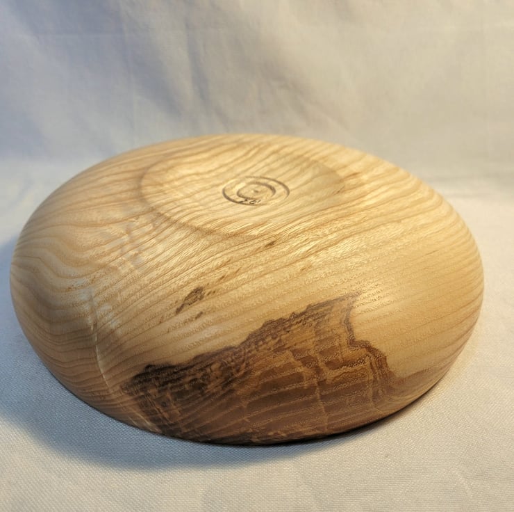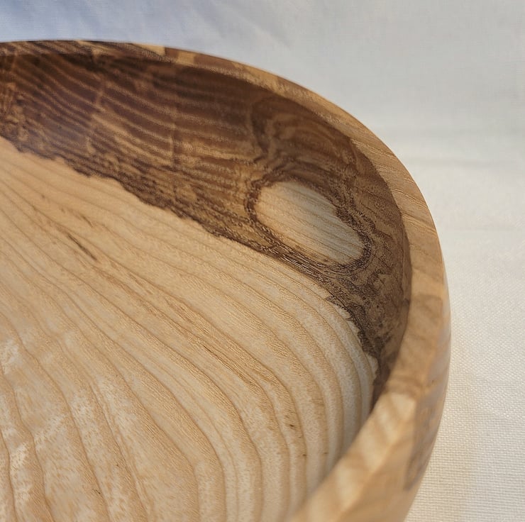 Ash food/small fruit bowl, 200 x 50mm (20 x 5cm) A nicely curving closed form Ash bowl with an narrow in-sloping rim. It is golden brown with a curving grain pattern, with a little bit of gentle ripple in the base grain, down one side it has an area of Olive ash heart wood in lovely swirling patterns of chocolate tones. Ideal for display, food or even a small fruit bowl.