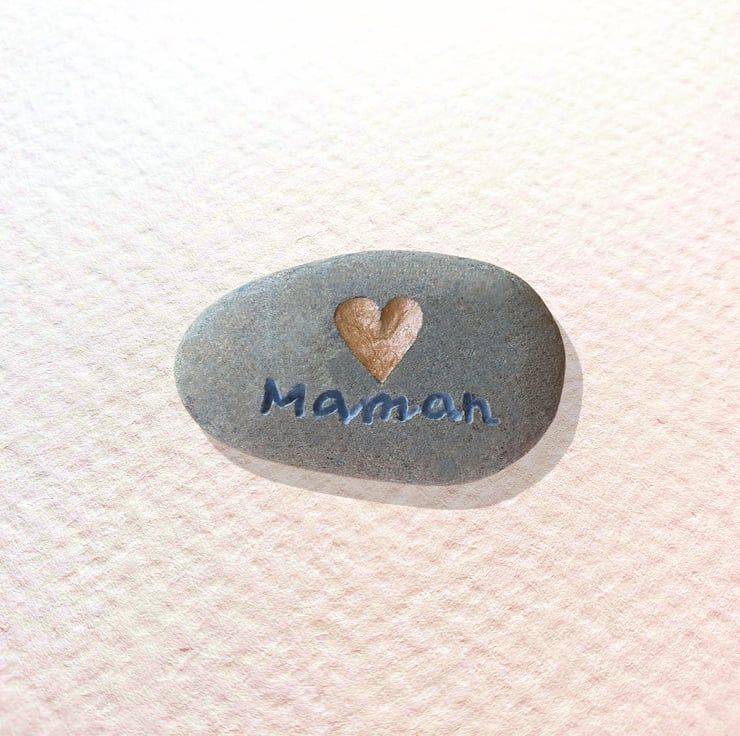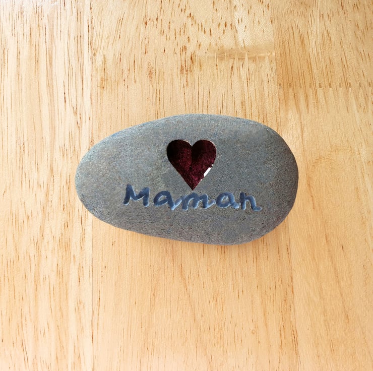 A smooth grey stone, deeply engraved with a heart symbol to give a contrast to the stone surface and the word 'Maman' deeply engraved underneath. The deep heart shape is partially filled with a gold colour enamel as standard but there are five colour options in total for the heart: Blue, Gold, Green, Purple & Red. This thoughtful gift could be given as a pocket hug and used as a paper weight, book end or an ornament for a desk, window cill or mantelpiece and given for a birthday, wedding anniversary, engagement gift, Christmas present, memorial stone or just to say 'I love you'...