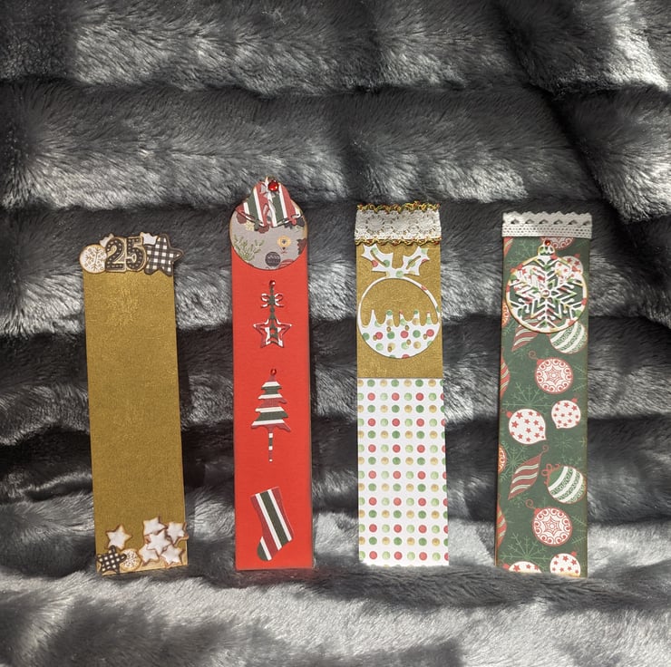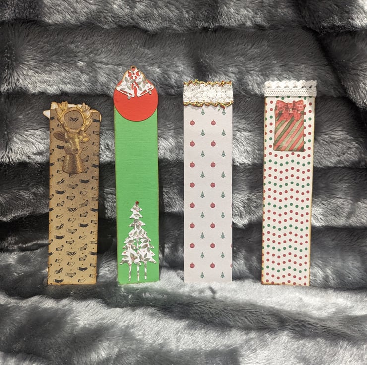 4-pack cardboard bookmarks covered in different patterned Christmas paper with bit and bobs of decorations at the top of each