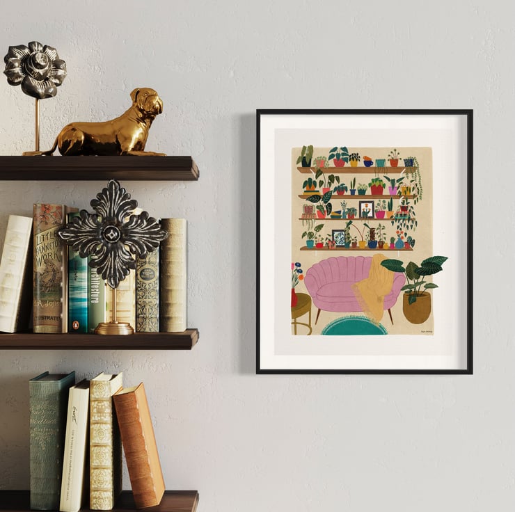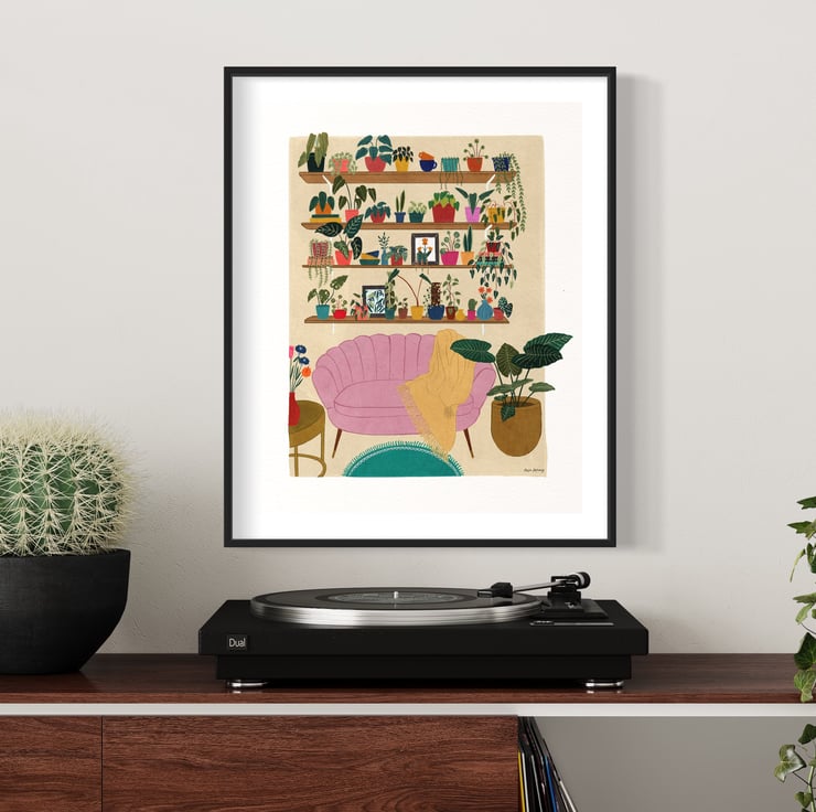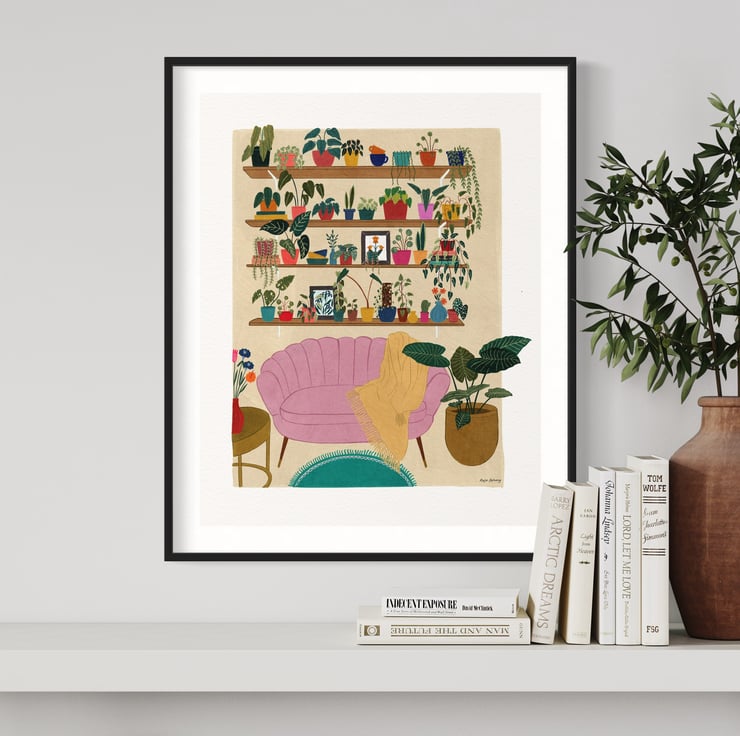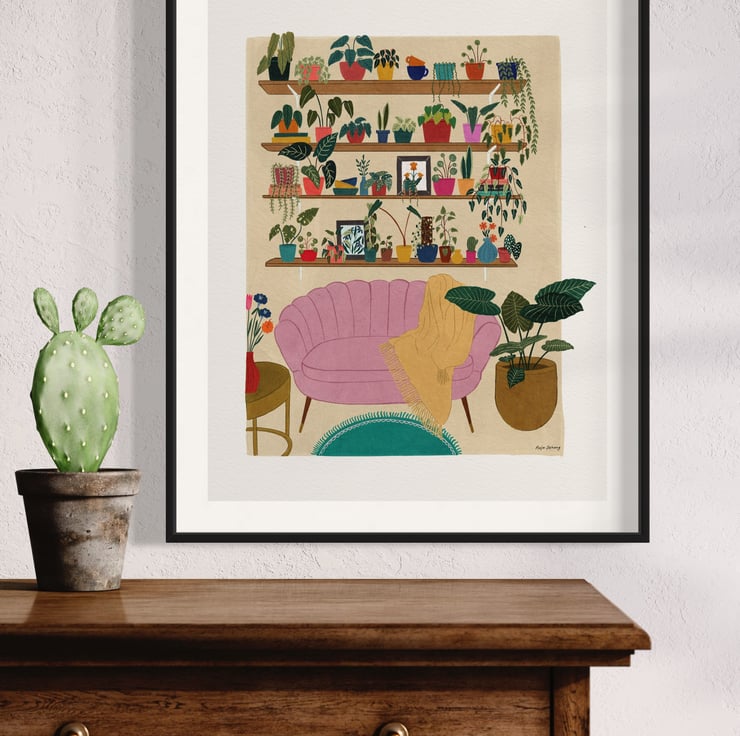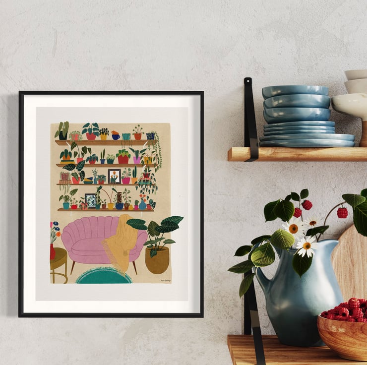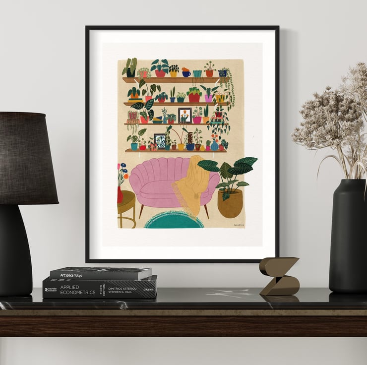 I love to draw corners of rooms. I saw this room as a photograph in a magazine and really admired the wall full of plants on the shelves. It’s almost like the illustration telling you a story, of perhaps who lives in the house, what their interests must be and more importantly you also want to step into the illustration and look at what’s on those shelves.